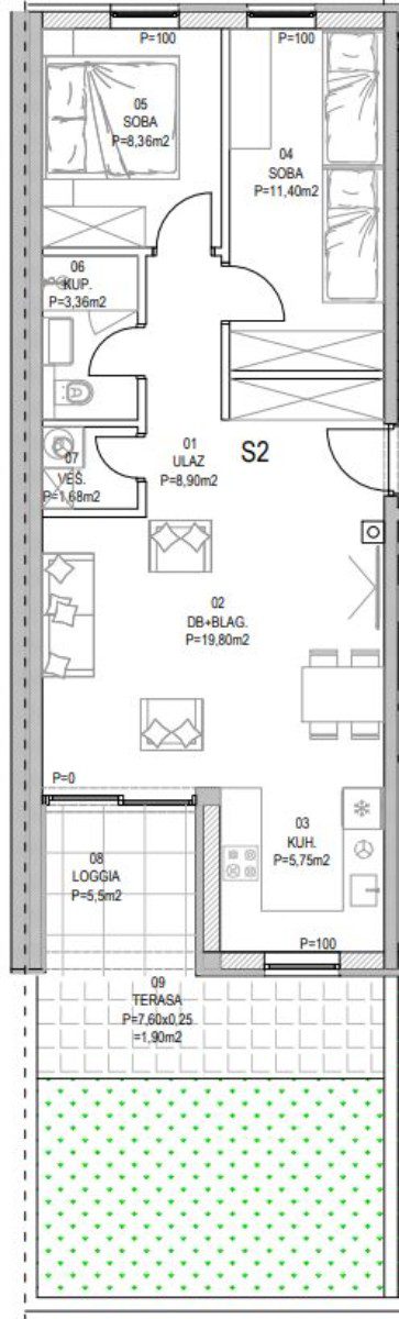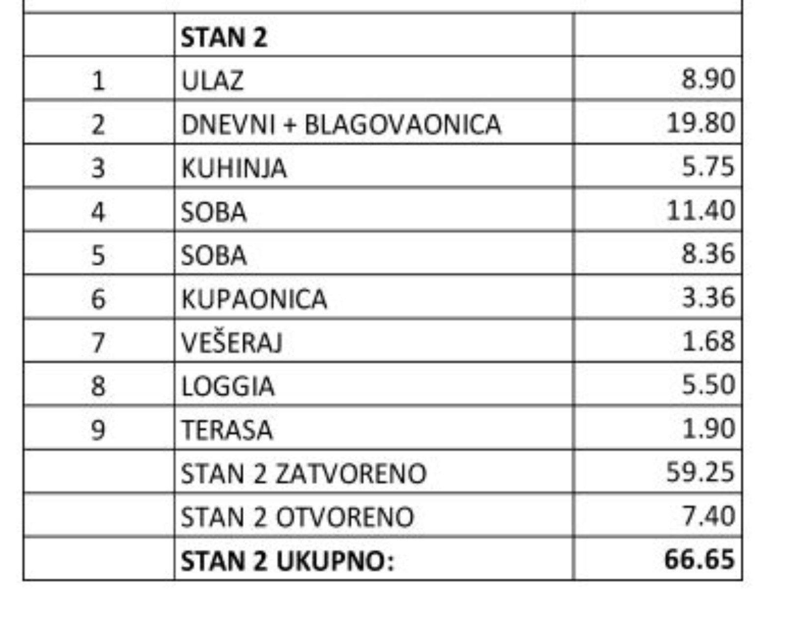 Stan se sastoji od dvije spavaće sobe, kupaonice, dnevnog boravka s blagovaonicom te kuhinjom. Ima i terasu površine 1,90 m² te loggiu površine 5,50 m². Uz stan je moguće kupiti vanjsko parkirno mjesto po cijeni od 5000 EUR.