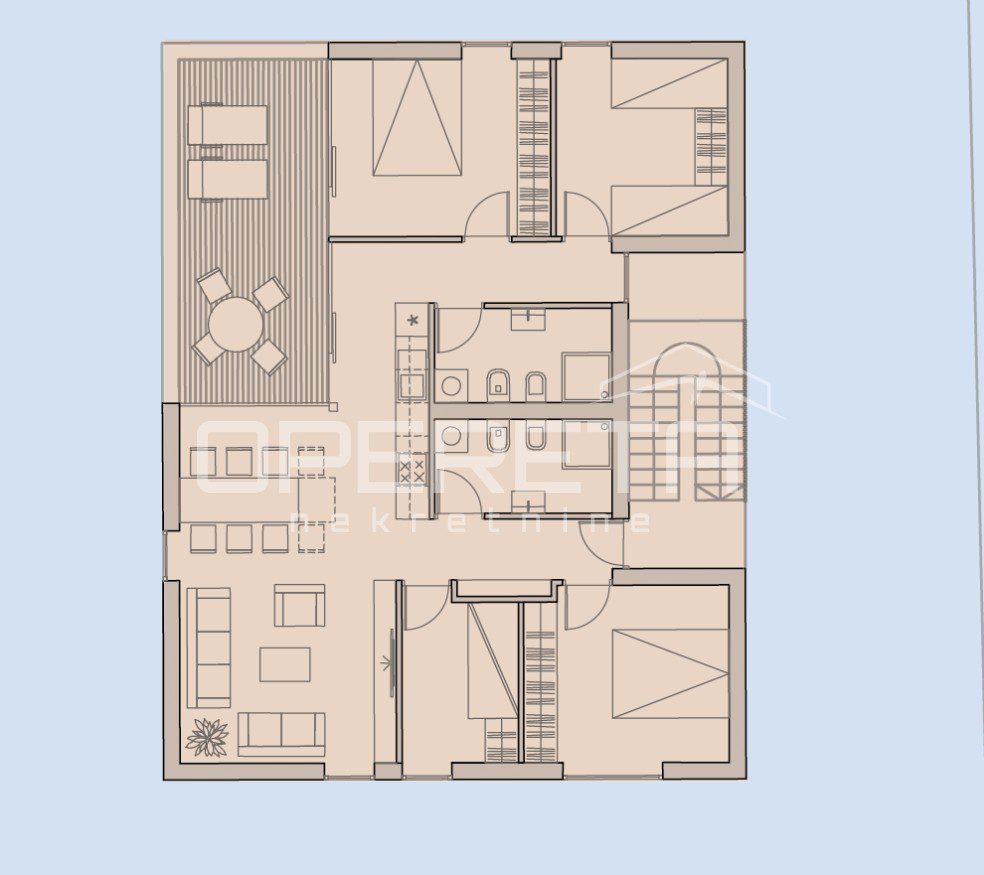 Stan se sastoji od ulaznog hodnika, dnevnog boravka s blagovaonom, kuhinjom, četiri spavaće sobe, dva hodnika, terase i krovne terase.