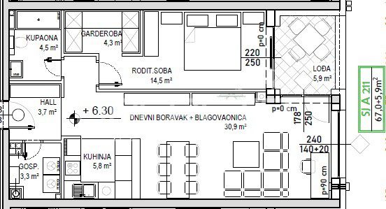Prodaje se stan površine 67,0 m2 s lođom površine 5,9 m2 na 2. katu niskoenergetske stambeno – poslovne zgrade na odličnoj lokaciji. Zgrada se sastoji od podruma, visokog prizemlja, prvog, drugog i trećeg kata te sadrži ukupno 74 stambene jedinice i 7 poslovnih prostora. Završetak gradnje predviđen je krajem 2025./početak 2026. Energetski razred je A+. Moguć je odabir podnih obloga (keramika, parket ili laminat) te odabir unutarnje stolarije. Uz stan moguća je kupovina i vanjskog parkirnog mjesta po cijeni od 8.000,00 EUR, garažnog mjesta bez spremišta po cijeni od 14.000,00 EUR, garažnog mjesta sa spremištem do 17,4 m2 po cijeni od 17.500,00 EUR, garažnog mjesta sa spremištem do 19,4 m2 po cijeni od 19.500,00 EUR ili garažnog mjesta sa spremištem do 20,6 m2 po cijeni od 22.500,00 EUR.