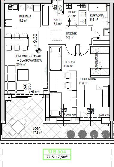 Prodaje se stan površine 72,5 m2 s lođom površine 17,9 m2 na 3. katu niskoenergetske stambeno – poslovne zgrade na odličnoj lokaciji. Zgrada se sastoji od podruma, visokog prizemlja, prvog, drugog i trećeg kata te sadrži ukupno 74 stambene jedinice i 7 poslovnih prostora. Završetak gradnje predviđen je krajem 2025./početak 2026. Energetski razred je A+. Moguć je odabir podnih obloga (keramika, parket ili laminat) te odabir unutarnje stolarije. Uz stan moguća je kupovina i vanjskog parkirnog mjesta po cijeni od 8.000,00 EUR, garažnog mjesta bez spremišta po cijeni od 14.000,00 EUR, garažnog mjesta sa spremištem do 17,4 m2 po cijeni od 17.500,00 EUR, garažnog mjesta sa spremištem do 19,4 m2 po cijeni od 19.500,00 EUR ili garažnog mjesta sa spremištem do 20,6 m2 po cijeni od 22.500,00 EUR.