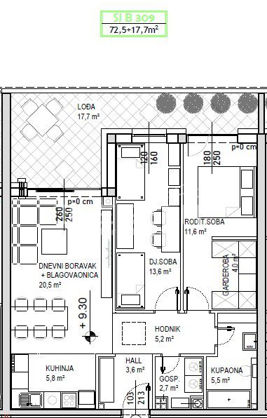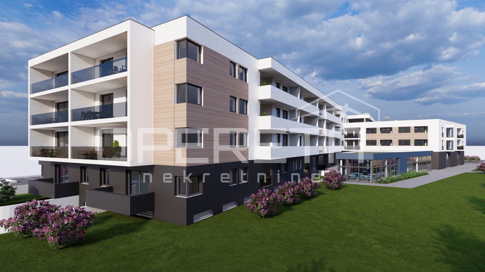 Prodaje se stan površine 72,5 m2 s lođom površine 17,7 m2 na 3. katu niskoenergetske stambeno – poslovne zgrade na odličnoj lokaciji. Zgrada se sastoji od podruma, visokog prizemlja, prvog, drugog i trećeg kata te sadrži ukupno 74 stambene jedinice i 7 poslovnih prostora. Završetak gradnje predviđen je krajem 2025./početak 2026. Energetski razred je A+. Moguć je odabir podnih obloga (keramika, parket ili laminat) te odabir unutarnje stolarije. Uz stan moguća je kupovina i vanjskog parkirnog mjesta po cijeni od 8.000,00 EUR, garažnog mjesta bez spremišta po cijeni od 14.000,00 EUR, garažnog mjesta sa spremištem do 17,4 m2 po cijeni od 17.500,00 EUR, garažnog mjesta sa spremištem do 19,4 m2 po cijeni od 19.500,00 EUR ili garažnog mjesta sa spremištem do 20,6 m2 po cijeni od 22.500,00 EUR.