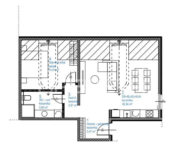 Stan B5 je osmišljen za maksimalnu funkcionalnost i ugodan boravak te se sastoji od hodnika, prostranog dnevnog boravka s blagovaonicom, kuhinje, spavaće sobe i kupaonice s toaletom . Uz stan dolazi veliko garažno parkirno mjesto (17,4 m2). Stan je obasjan prirodnom svjetlošću zahvaljujući velikim otvorima te ima pogled na more.