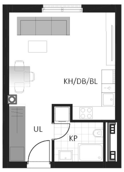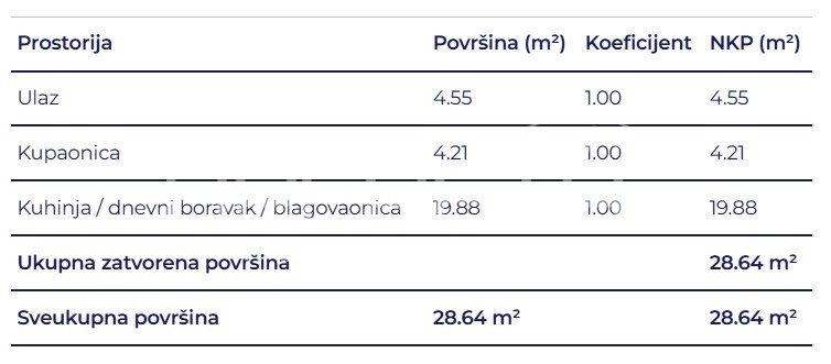 Prostrani jednosobni stan sastoji se od kupaonice, hodnika, dnevnog boravka s kuhinjom i blagovaonicom.