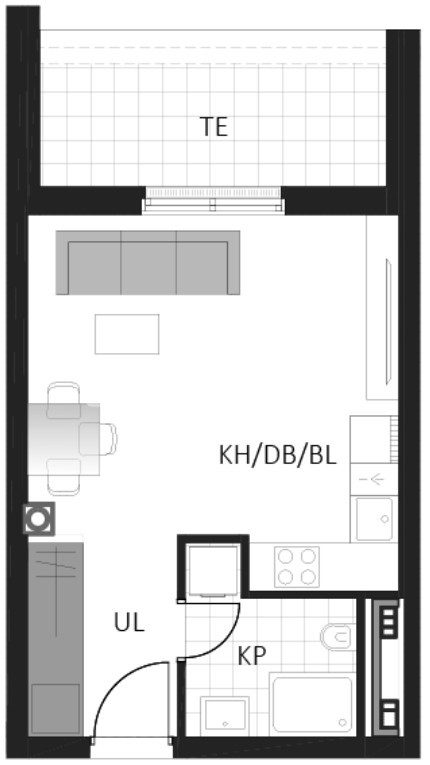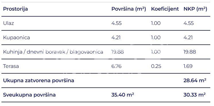 Prostrani jednosobni stan sastoji se od kupaonice, hodnika, otvorenog dnevnog boravka s kuhinjom i blagovaonicom te terase.