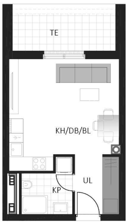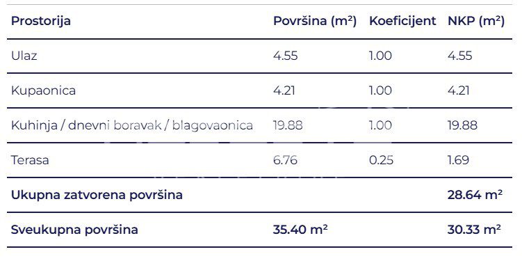 Prostrani jednosobni stan sastoji se od kupaonice, hodnika, otvorenog dnevnog boravka s kuhinjom i blagovaonicom te terase.