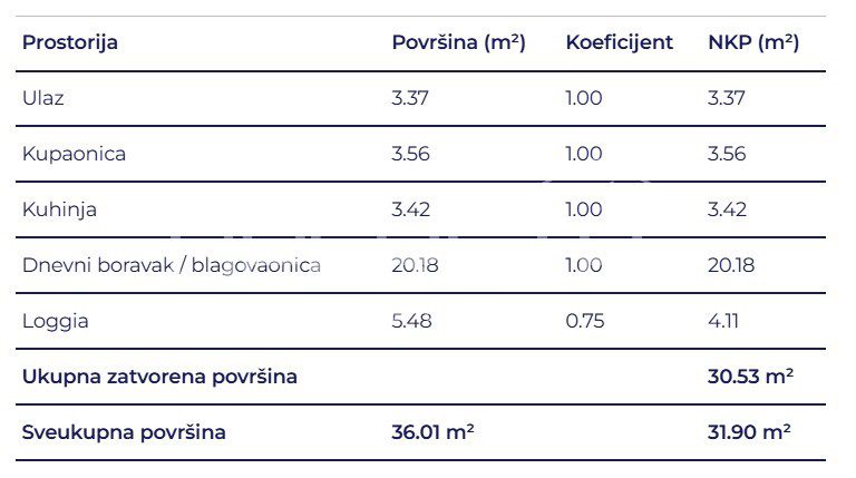 Prostrani jednosobni stan sastoji se od kupaonice, hodnika, dnevnog boravka s kuhinjom i blagovaonicom, loggie.