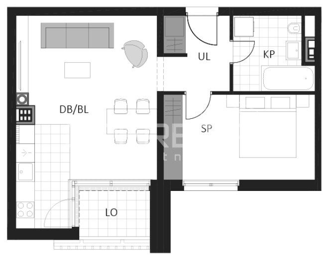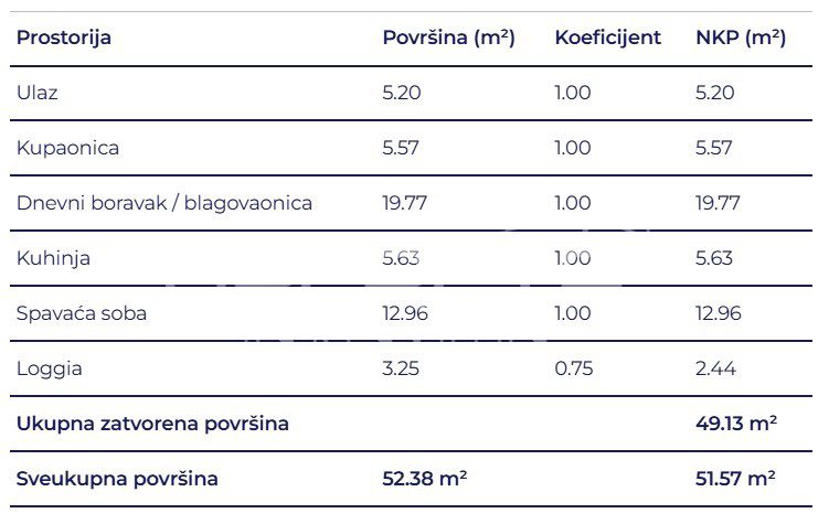 Prostrani dvosobni stan sastoji se od spavaće sobe, kupaonice, hodnika, dnevnog boravka s kuhinjom i blagovaonicom i loggie.