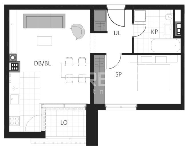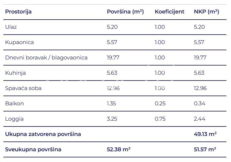 Prostrani dvosobni stan sastoji se od spavaće sobe, kupaonice, hodnika, dnevnog boravka s kuhinjom i blagovaonicom, balkona i loggie.