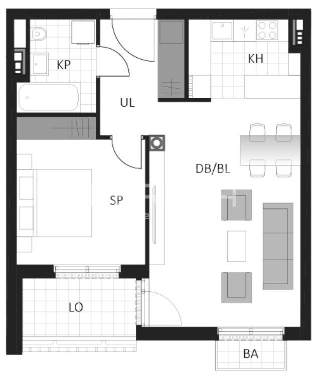 Prostrani dvosobni stan sastoji se od spavaće sobe, kupaonice, hodnika, dnevnog boravka s kuhinjom i blagovaonicom, loggie i balkona.
