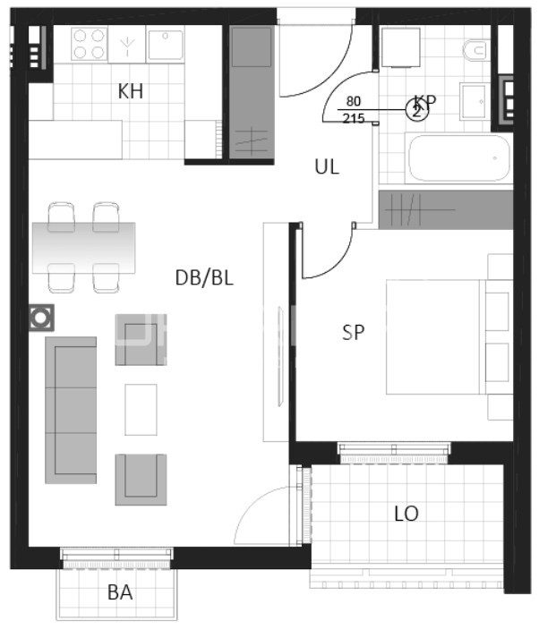 Prostrani dvosobni stan sastoji se od spavaće sobe, kupaonice, hodnika, dnevnog boravka s kuhinjom i blagovaonicom, loggie i natkrivenog balkona.