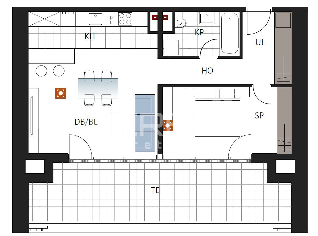 Prostrani dvosoni stan sastoji se od spavaće sobe, kupaonice, hodnika, dnevnog boravka s kuhinjom i blagovaonicom, terase.