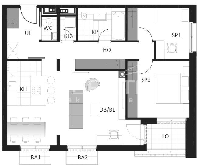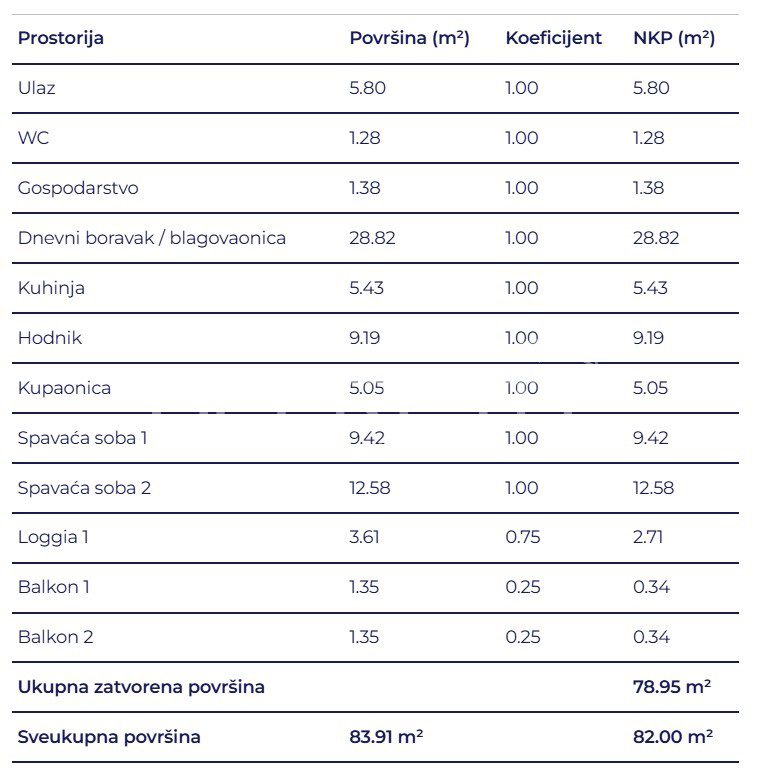 Prostrani trosobni stan sastoji se od dvije spavaće sobe, kupaonice, wc-a, ostave, hodnika, dnevnog boravka s kuhinjom i blagovaonicom, loggie i 2 balkona.