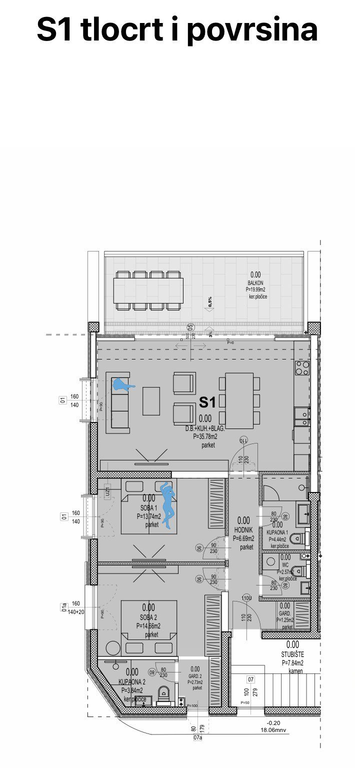 U srcu mirne i atraktivne gradske četvrti smjestio se prostran i svijetao stan koji nudi visoku razinu udobnosti i sigurnosti. Smješten u vrhunskoj novogradnji, ovaj stan površine 95,37 m2 pažljivo je osmišljen kako bi pružio maksimalnu funkcionalnost i udobnost. Otvoren i prozračan dnevni prostor s kuhinjom i blagovaonicom savršeno se nadovezuje na veliku terasu, idealnu za opuštanje i uživanje u svakodnevici. Dvije spavaće sobe pružaju miran kutak za odmor, dok dvije moderno uređene kupaonice i zaseban toalet dodatno doprinose udobnosti. Svaka prostorija obiluje prirodnim svjetlom zahvaljujući velikim otvorima, dok visina stropa od 2,90 metara dodatno pojačava dojam prostranosti.
