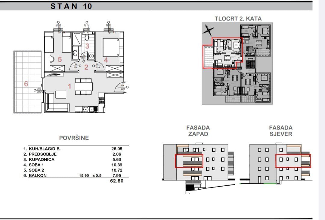 Stan se sastoji od kuhinje, blagovaonice i dnevnog boravka površine 26,06 m2, dvije odvojene spavaće sobe (10,39 m2 i 10,72 m2), kupaonice od 5,63 m2 te predsoblja. Balkon od 15,90 m2 dodatni je kvalitetan vanjski prostor.