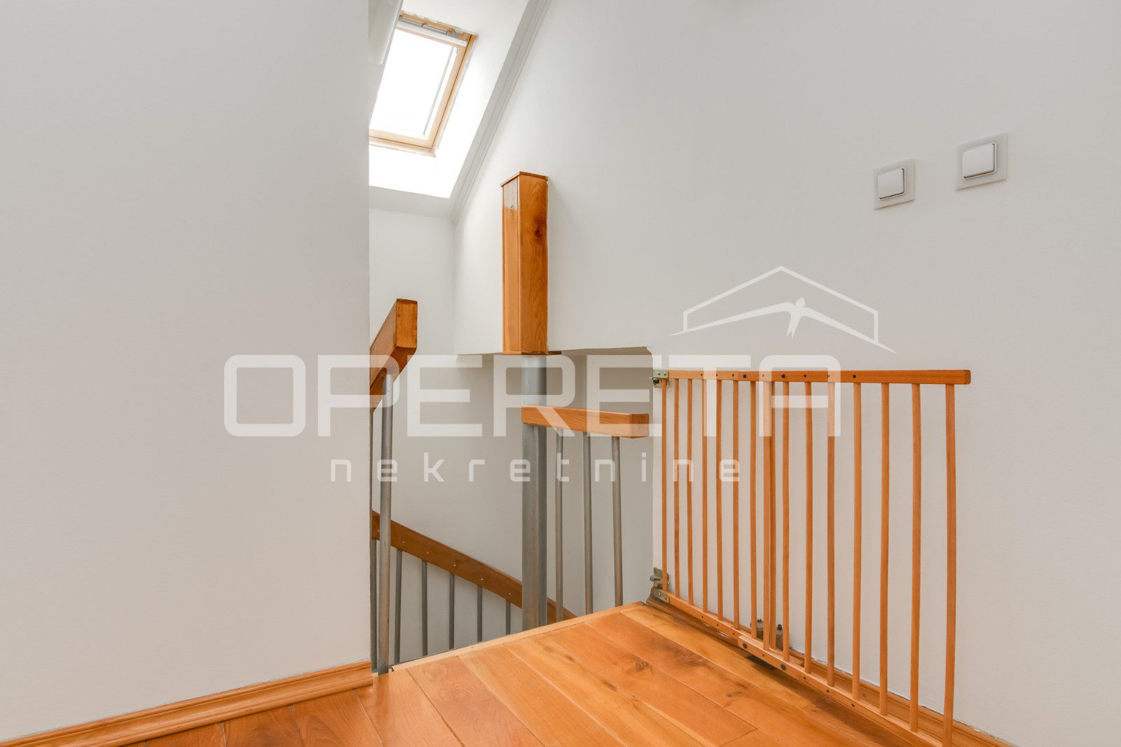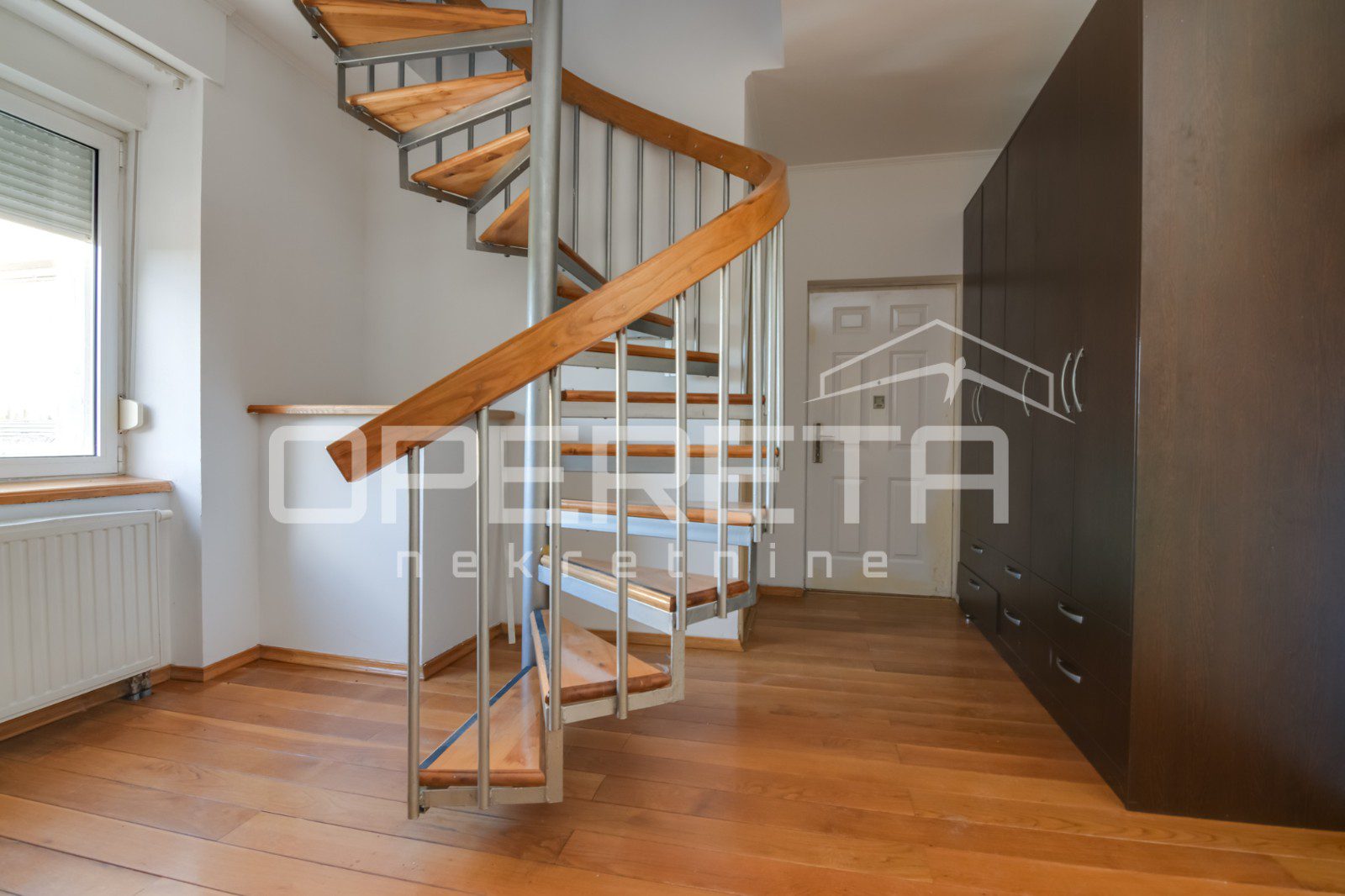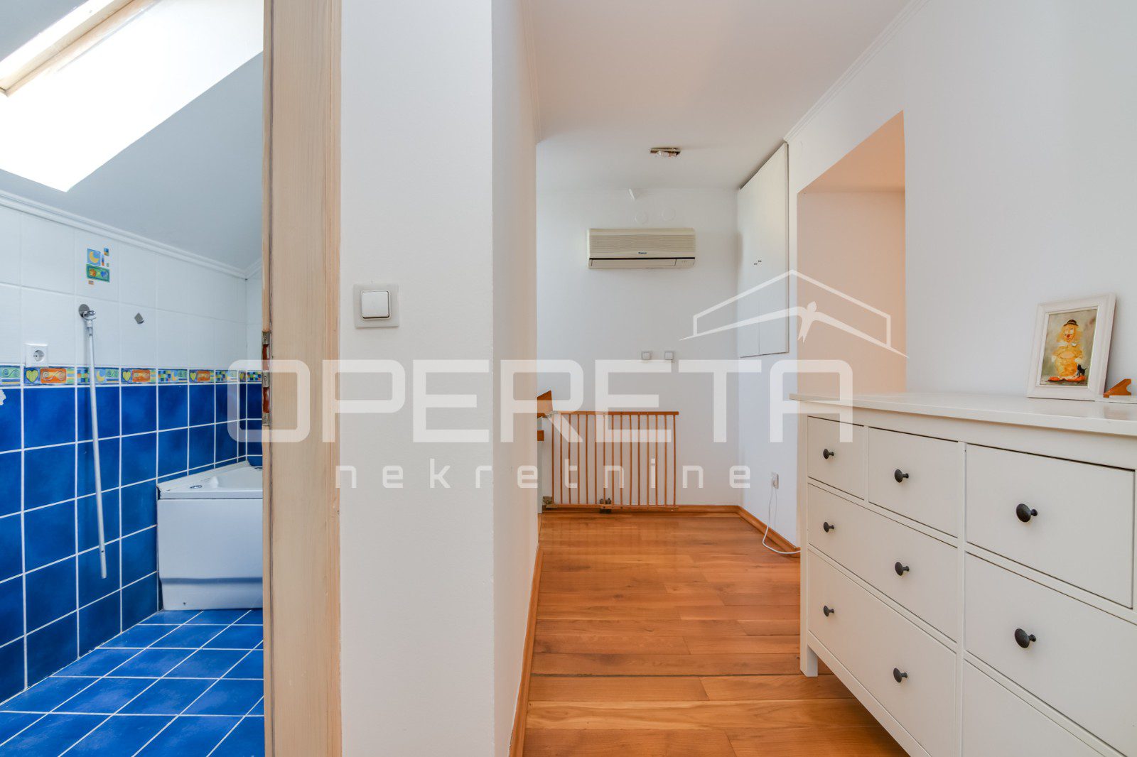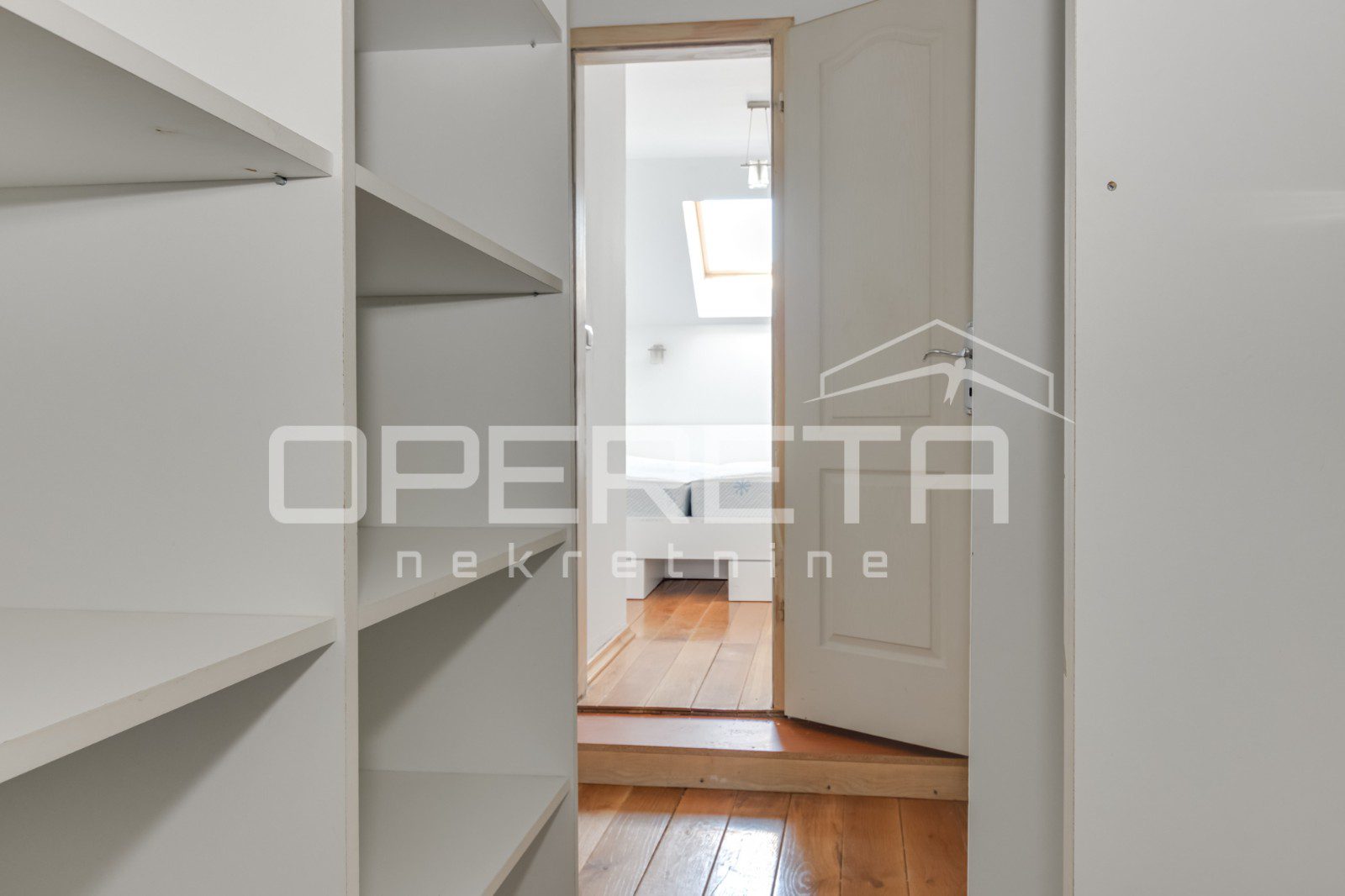 Prostran i komforan stan na 1. katu i potkrovlju zgrade u najužem centru grada. NKP prema zk 73,43 m2, SZ-JI orijentacije, prozračan i pun svjetla, razveden je na dvije etaže: na donjoj etaži nalazi se “open space” kuhinja s blagovaonicom te izlazom na prostranu terasu, dnevni boravak, hodnik i kupaonica s wc-om. Nutarnje stubište povezuje ju s potkrovljem gdje se nalaze dvije spavaće/radne sobe s velikim “walk-in” ormarom, kupaonica s wc-om i hodnik.