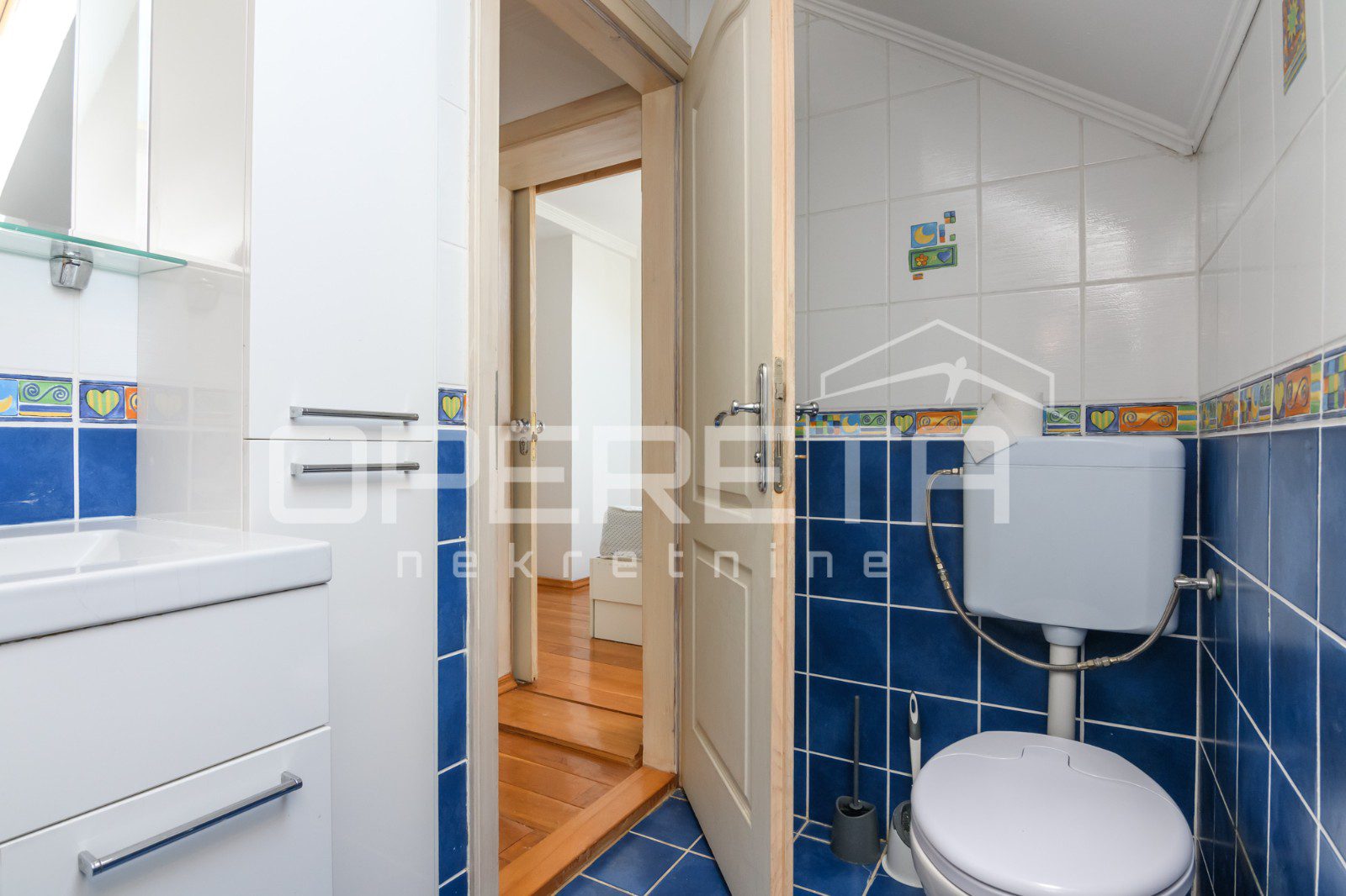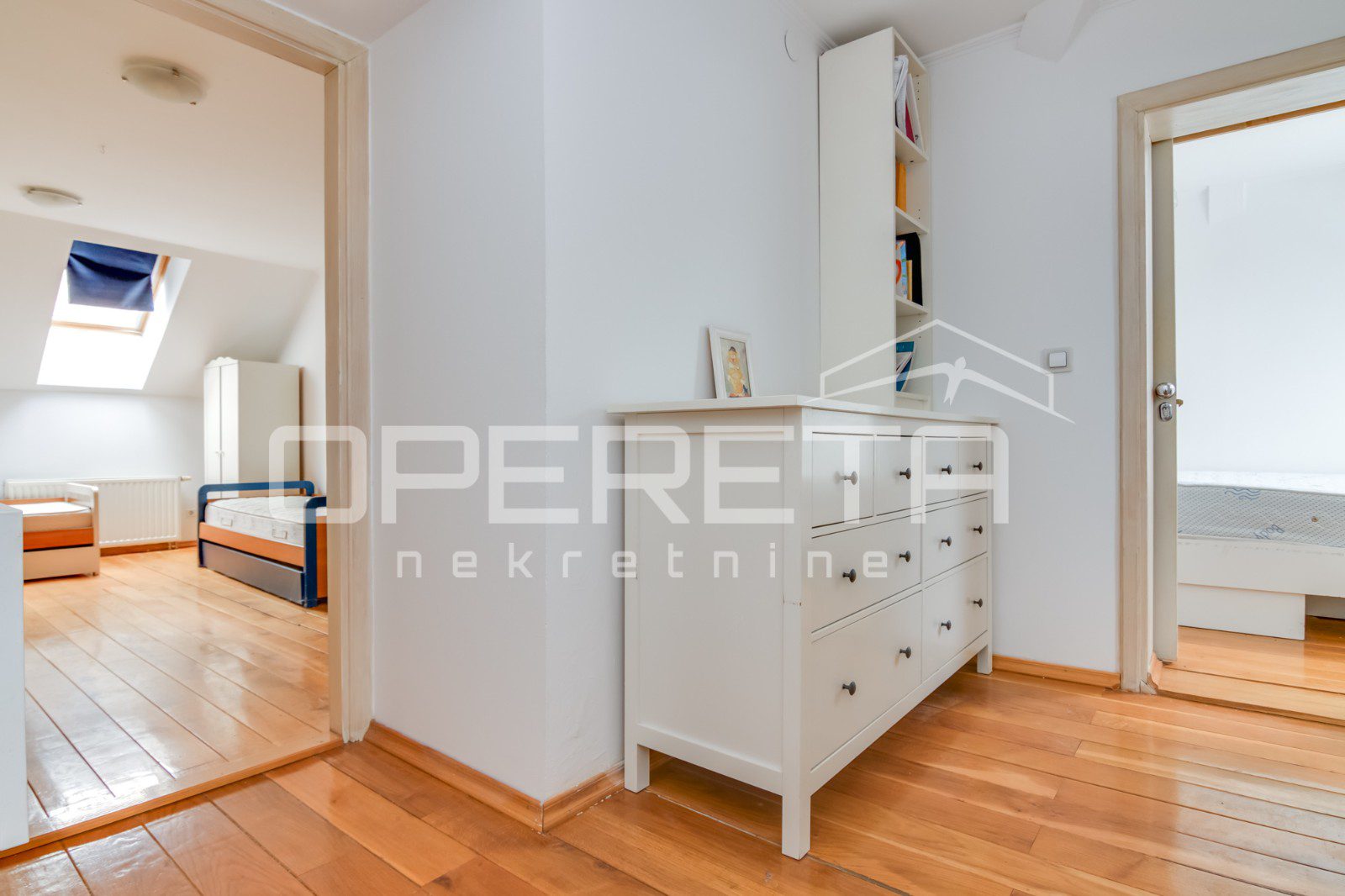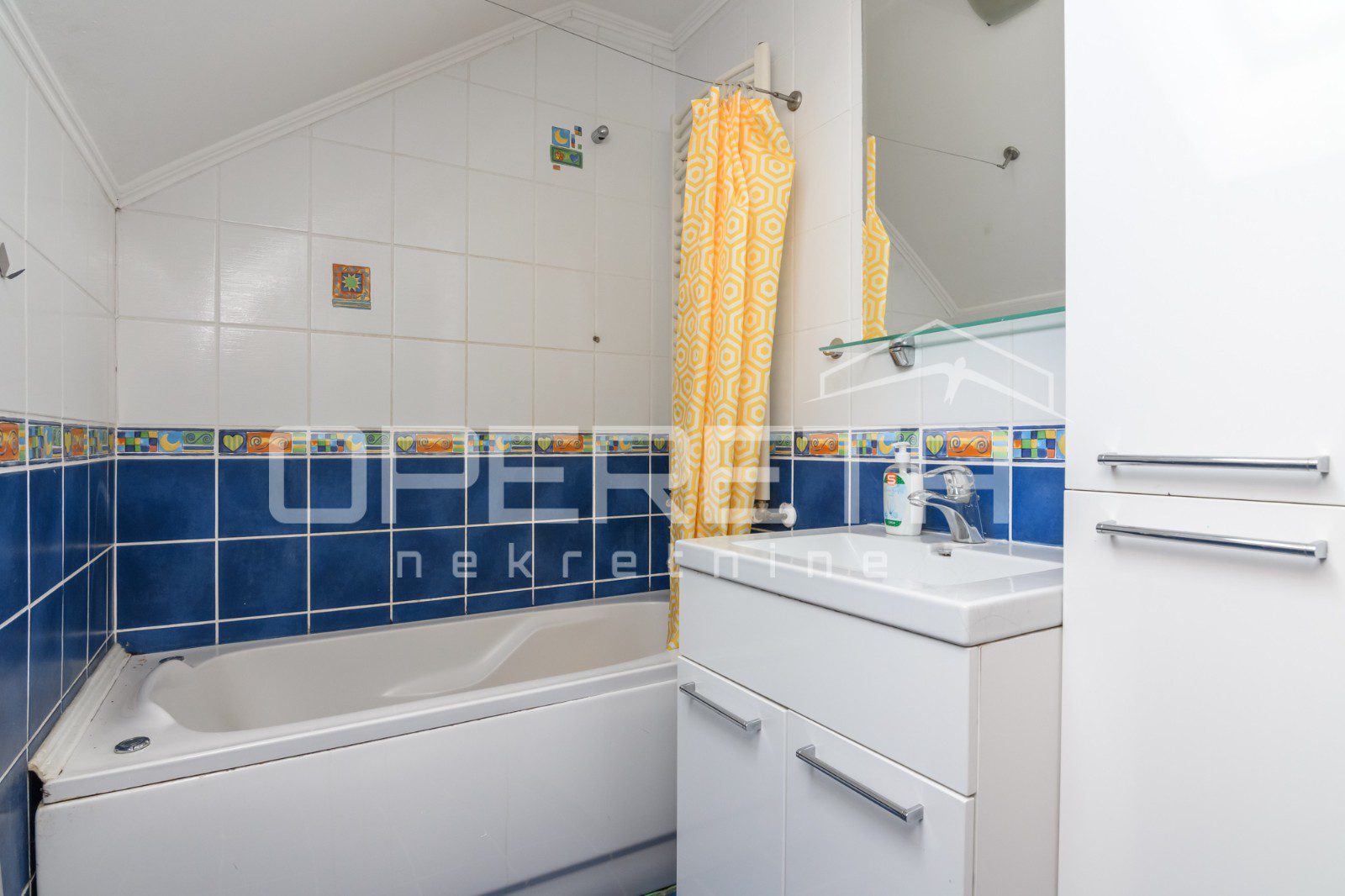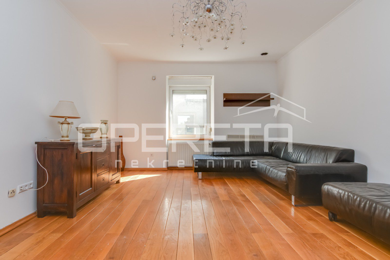 Prostran i komforan stan na 1. katu i potkrovlju zgrade u najužem centru grada. NKP prema zk 73,43 m2, SZ-JI orijentacije, prozračan i pun svjetla, razveden je na dvije etaže: na donjoj etaži nalazi se “open space” kuhinja s blagovaonicom te izlazom na prostranu terasu, dnevni boravak, hodnik i kupaonica s wc-om. Nutarnje stubište povezuje ju s potkrovljem gdje se nalaze dvije spavaće/radne sobe s velikim “walk-in” ormarom, kupaonica s wc-om i hodnik.