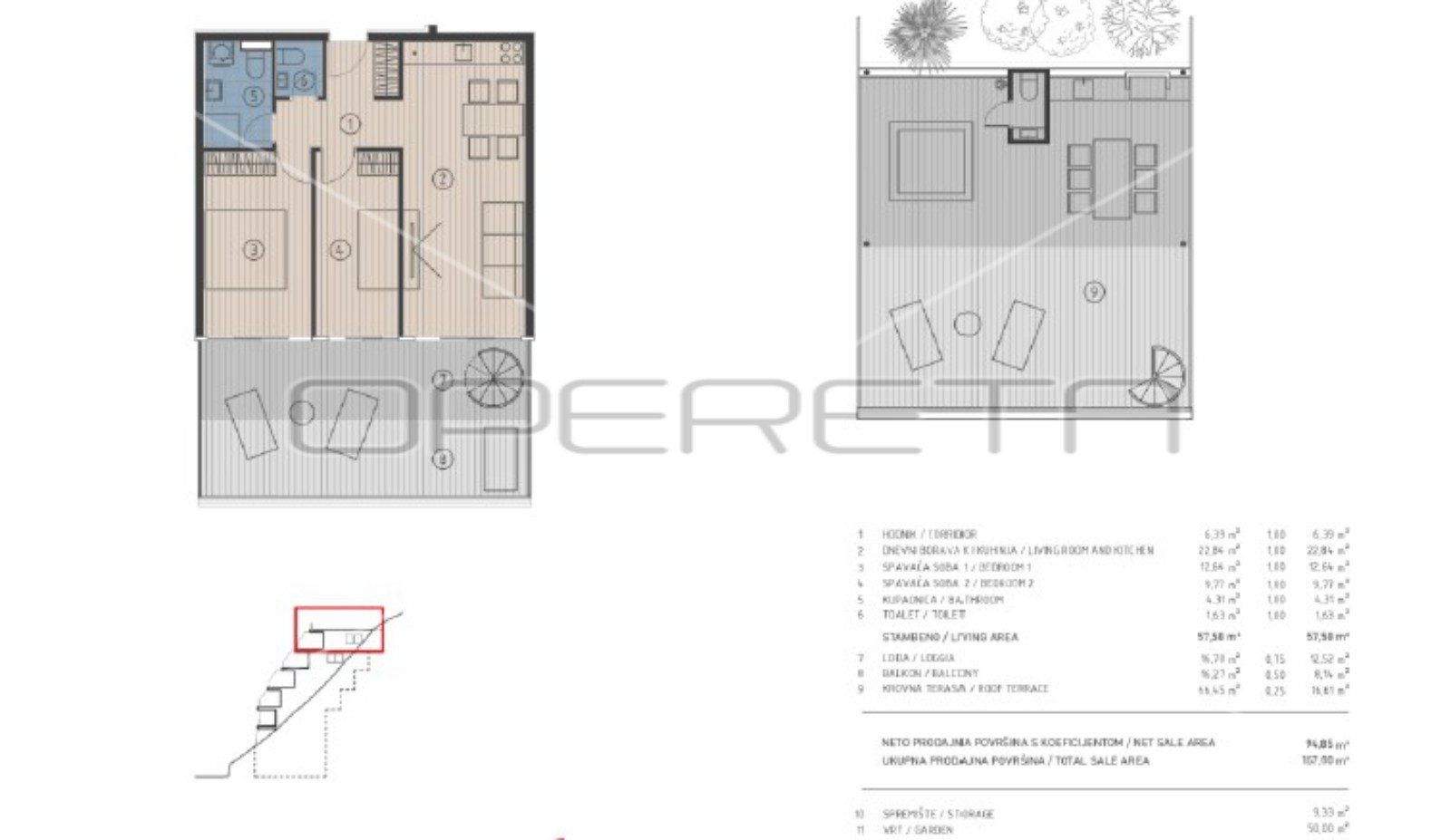 Prodaje se penthouse 402 u novogradnji nedaleko od Splita u mjestu Krilo Jesenice. Sastoji se od hodnika, dnevnog boravka sa kuhinjom i blagovaonicom, 2 spavaće sobe, kupaonice, wc-a, lođe, balkona i prekrasne krovne terase.
