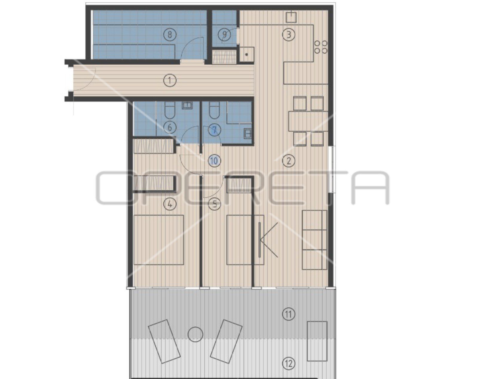 Prodaje se stan S303 na trećem katu novogradnje u Krilu Jesenice, nedaleko od Splita. Stan se sastoji od 2 hodnika, 2 spavaće sobe, 2 kupaonice, garderobe, ostave, dnevnog boravka sa kuhinjom i blagovaonicom, lođe od 12,52 m2 i blakona.