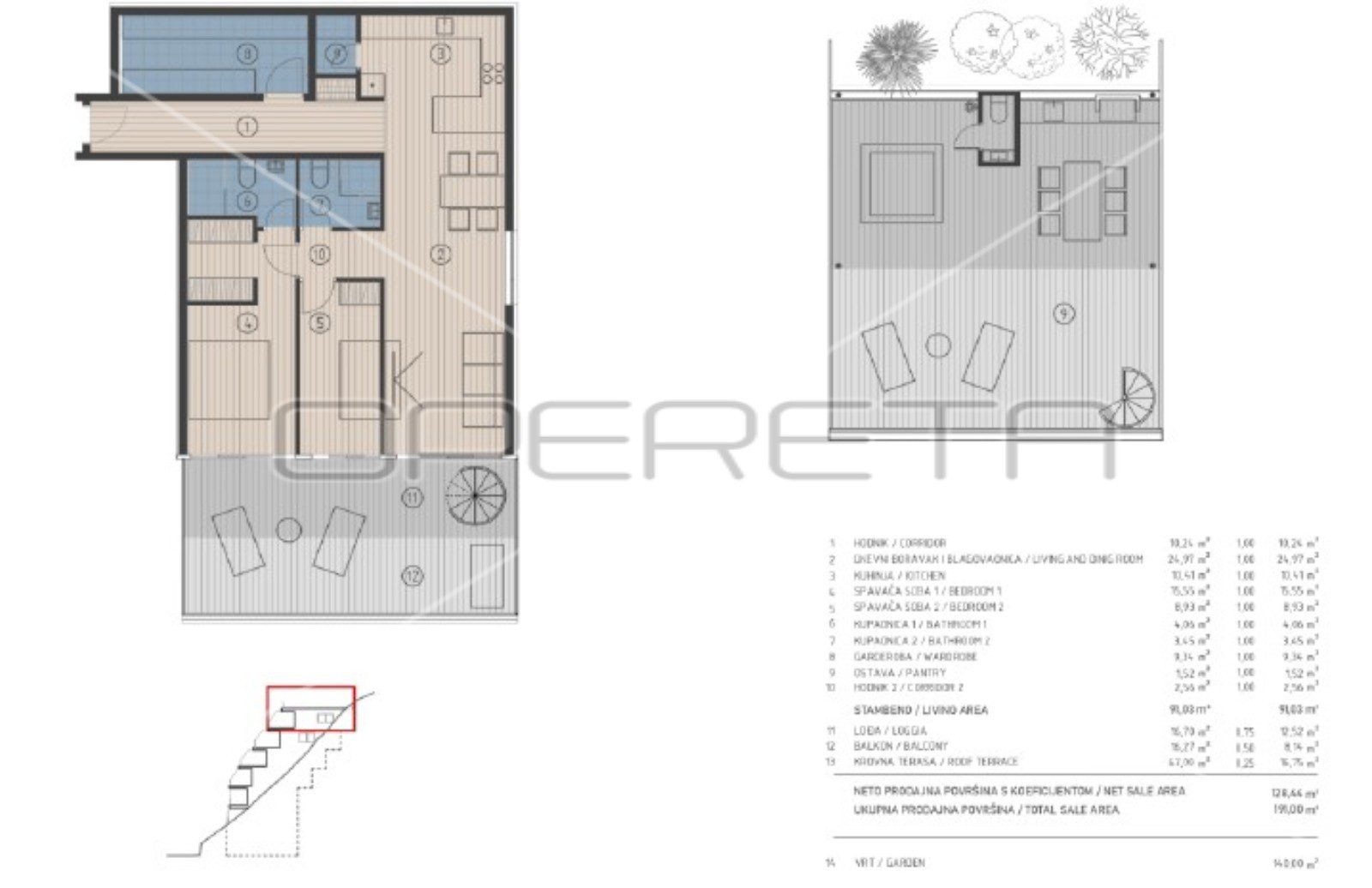 Prodaje se penthouse 403 u novogradnji nedaleko od Splita u mjestu Krilo Jesenice. Sastoji se od 2 hodnika, dnevnog boravka sa blagovaonicom, kuhinje, 2 spavaće sobe, 2 kupaonice, ostave, garderobe, lođe, balkona i prekrasne krovne terase.