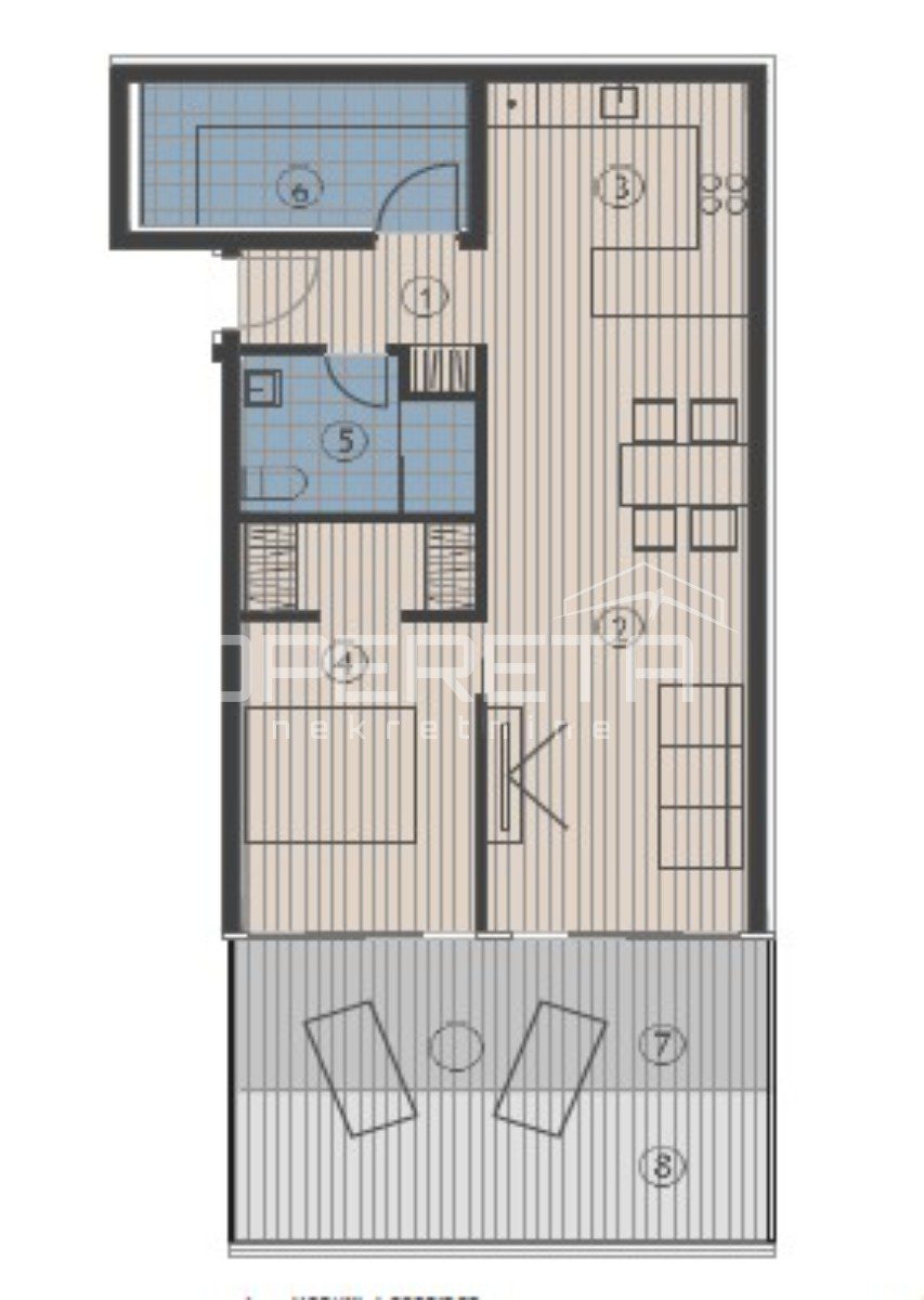 Prodaje se stan S104 na prvome katu novogradnje u Krilu Jesenice, nedaleko od Splita. Stan se sastoji od hodnika, spavaće sobe, kupaonice, dnevnog boravka sa kuhinjom i blagovaonicom, garderobe te lođom od 9,49 m2 i blakona površine 6,16 m2.