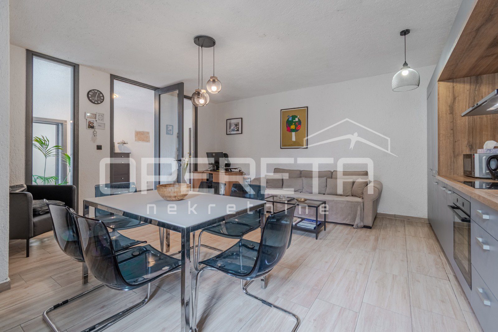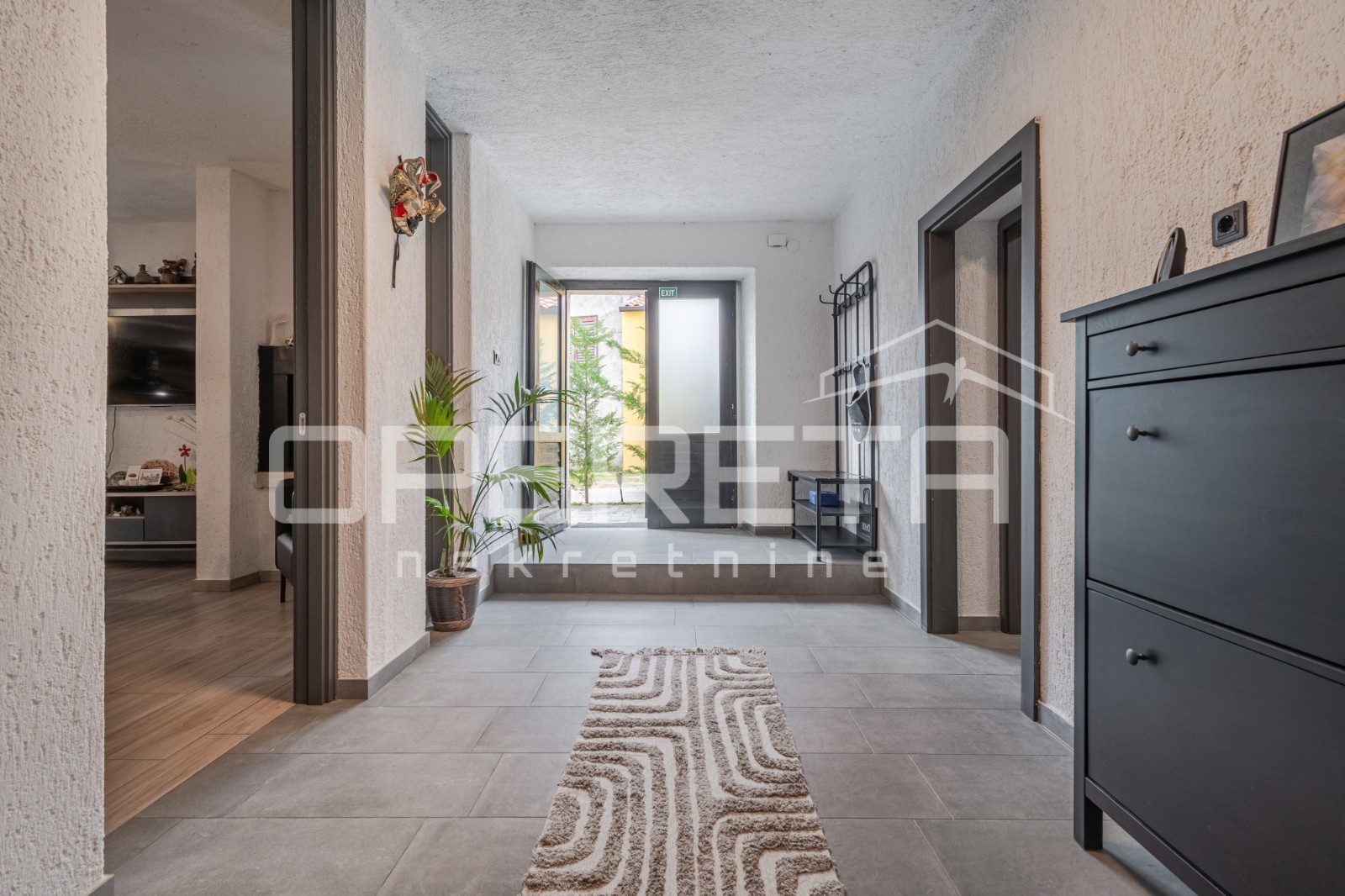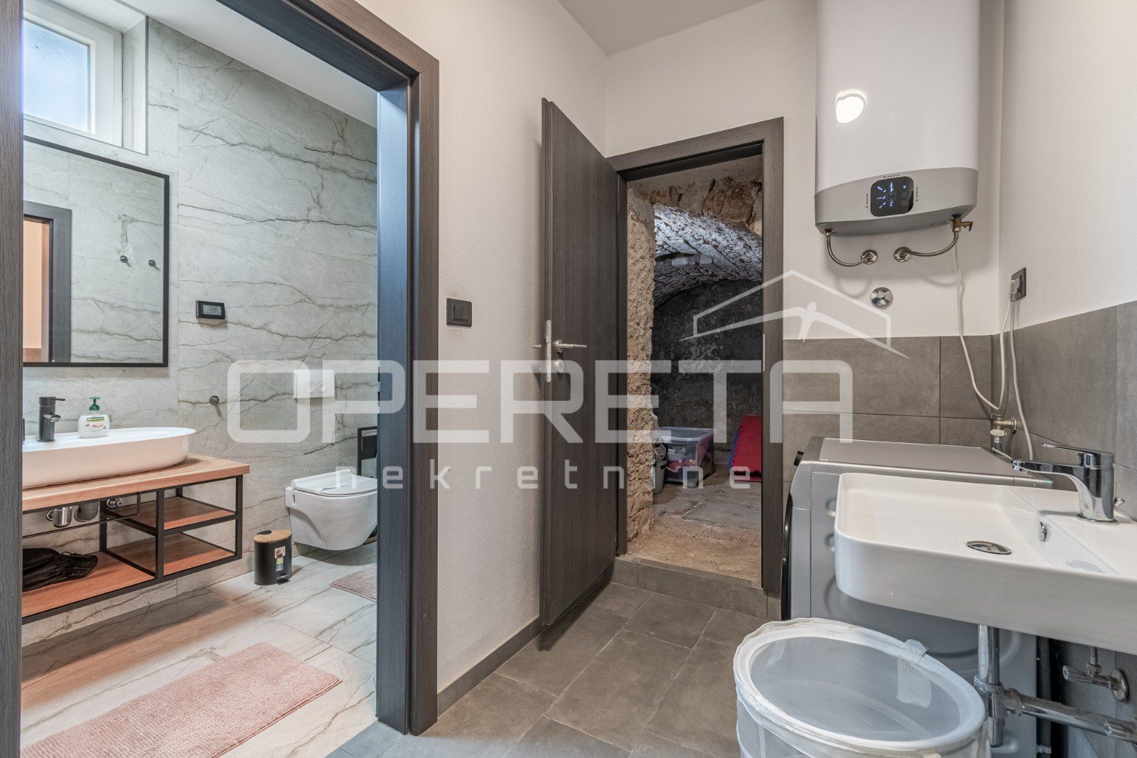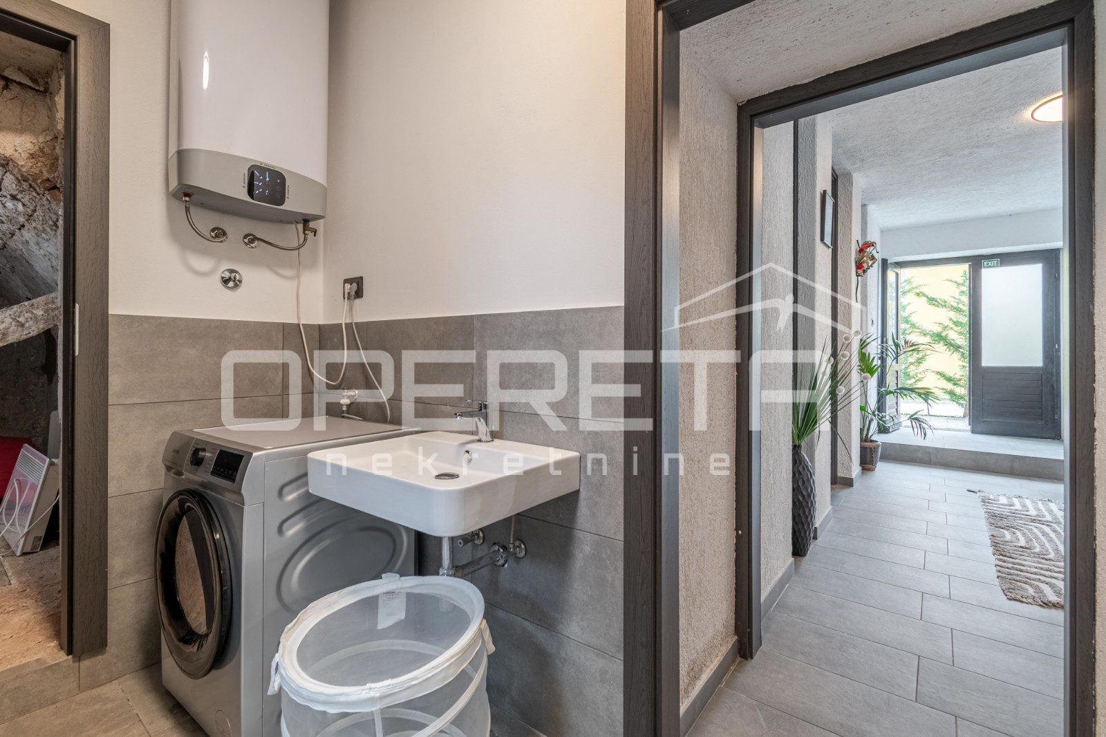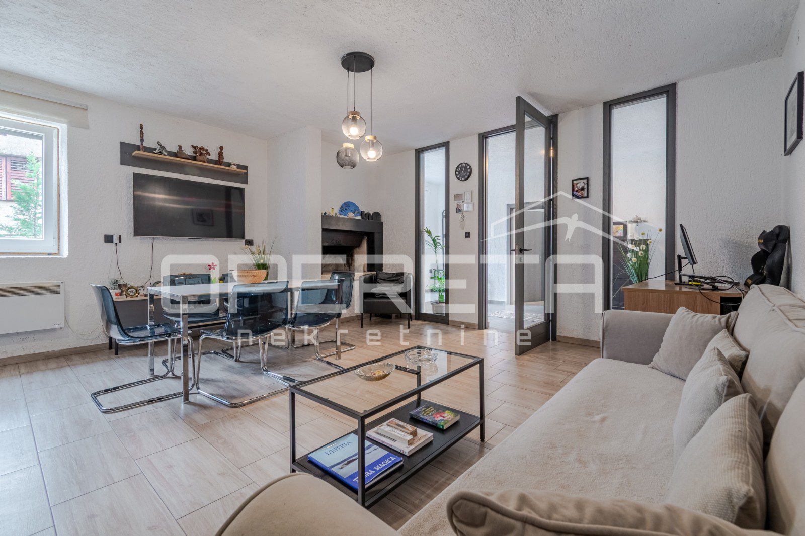 Na prodaju je moderan i potpuno uređen stan površine 90 m² u prizemlju kuće, idealan za ugodan život ili kao sigurna investicija. Stan je kompletno renoviran prije tri godine i od tada se uspješno koristi za turistički najam, pa je spreman za useljenje bez dodatnih ulaganja. Unutrašnjost nudi prostran “open space” dnevni boravak s modernom kuhinjom i blagovaonicom, a poseban ugođaj pruža veliki kamin koji je centralni dio prostora.