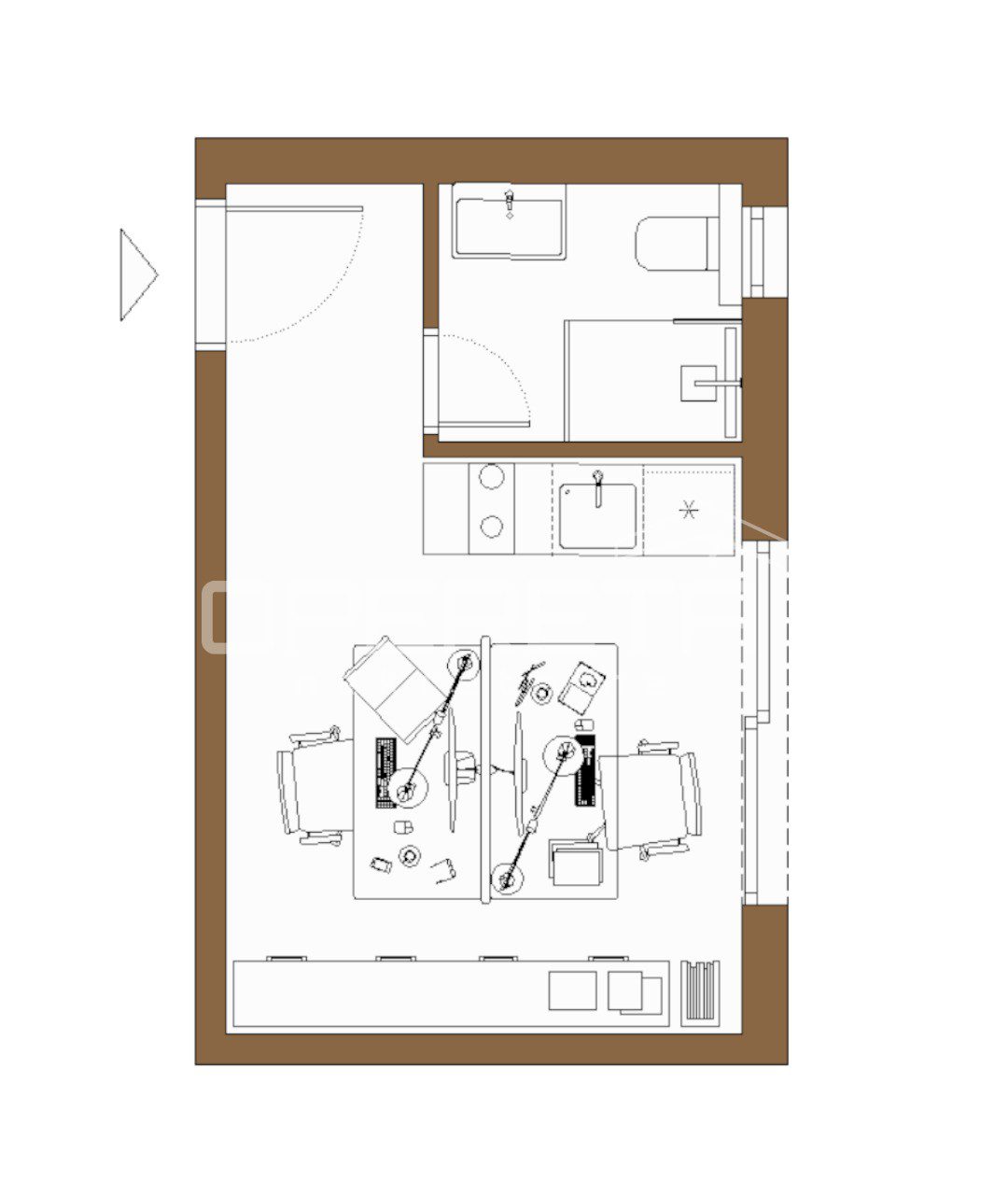 Ured se sastoji od jednog glavnog prostora površine 15 m² i WC-a.
