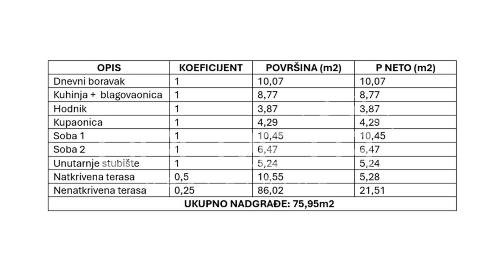 Sastoji se od kupaonice s toaletom, dvije spavaće sobe, otvorenog koncepta kuhinje, blagovaonice i dnevnog boravka, dok dodatnu vrijednost prostoru daju lođa i nenatkrivena terasa sa koje se pruža otvoreni pogled na more.