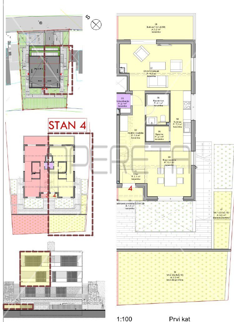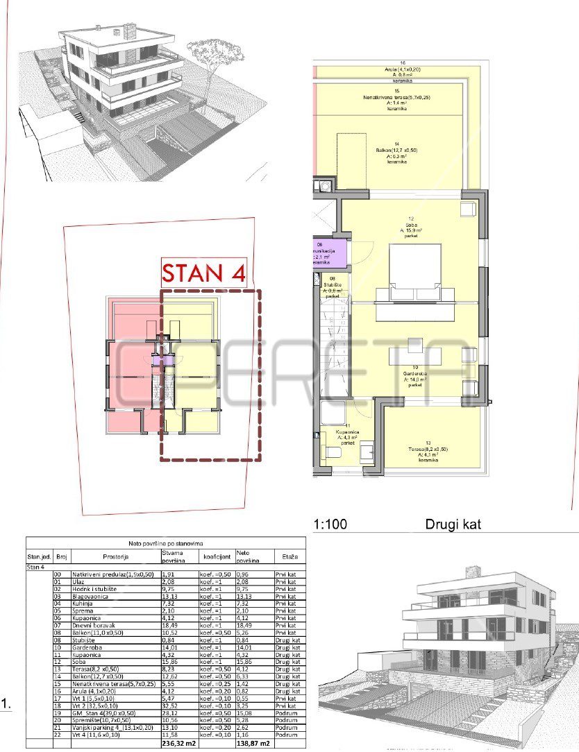 U zgradi se nalazi dvoetažni stan na katu od 138,87 m2. Prva etaža sastoji se od ulaznog hodnika koji vodi do svih prostorija, velike dnevne sobe s blagovaonicom koja ima izlaz na balkon, kuhinje smještene uz dnevnu sobu, kupaonice i spreme. Na drugoj etaži nalazi se spavaća soba, kupaonica, prostrana terasa te dodatni balkon.