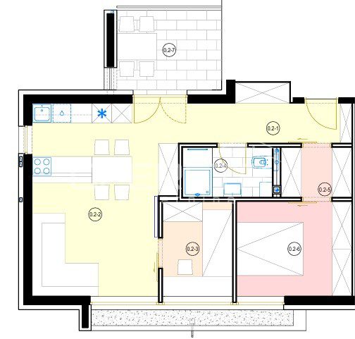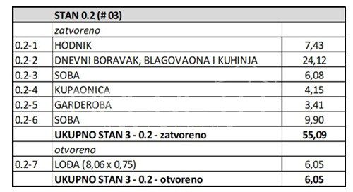 Stan oznake S3 nalazi se u visokom prizemlju stambene zgrade u izgradnji od ukupno 2 kata. Sastoji se od velikog “open space” dnevnog boravka s kuhinjom i blagovaonicom te izlazom na lođu, 2 sobe, kupaonice s wc-om, zasebne garderobe i hodnika.