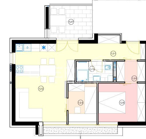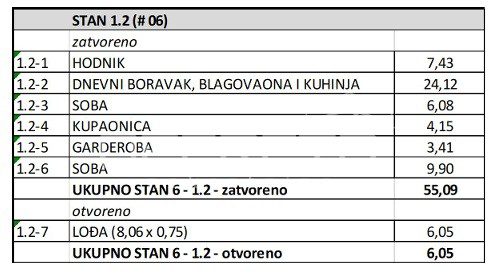 Stan oznake S6 nalazi se na 1. katu stambene zgrade u izgradnji od ukupno 2 kata. Sastoji se od velikog “open space” dnevnog boravka s kuhinjom i blagovaonicom te izlazom na lođu, 2 sobe, kupaonice s wc-om, zasebne garderobe i hodnika.