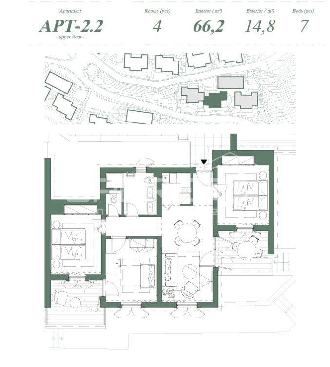Na izvanrednoj lokaciji na otoku Ugljanu, s pogledom na grad Zadar prodaje se apartman A 2.2. površine 84,00 m2. Smješten je na malom poluotoku usred šume u kojoj prevladava mirno okruženje, a blizina restorana, kafića i trgovina pruža dodatnu vrijednost samom mjestu. Apartman se sastoji od modernog open space dnevnog boravka, kuhinje, 3 spavaće sobe i 2 terase s kojih se prostire pogled na predivno okruženje i grad Zadar. U idućih nekoliko godina planirane su investicije u cijeli kompleks poluotoka te će se samim time povećati ponuda sadržaja i rast cijena apartmana.