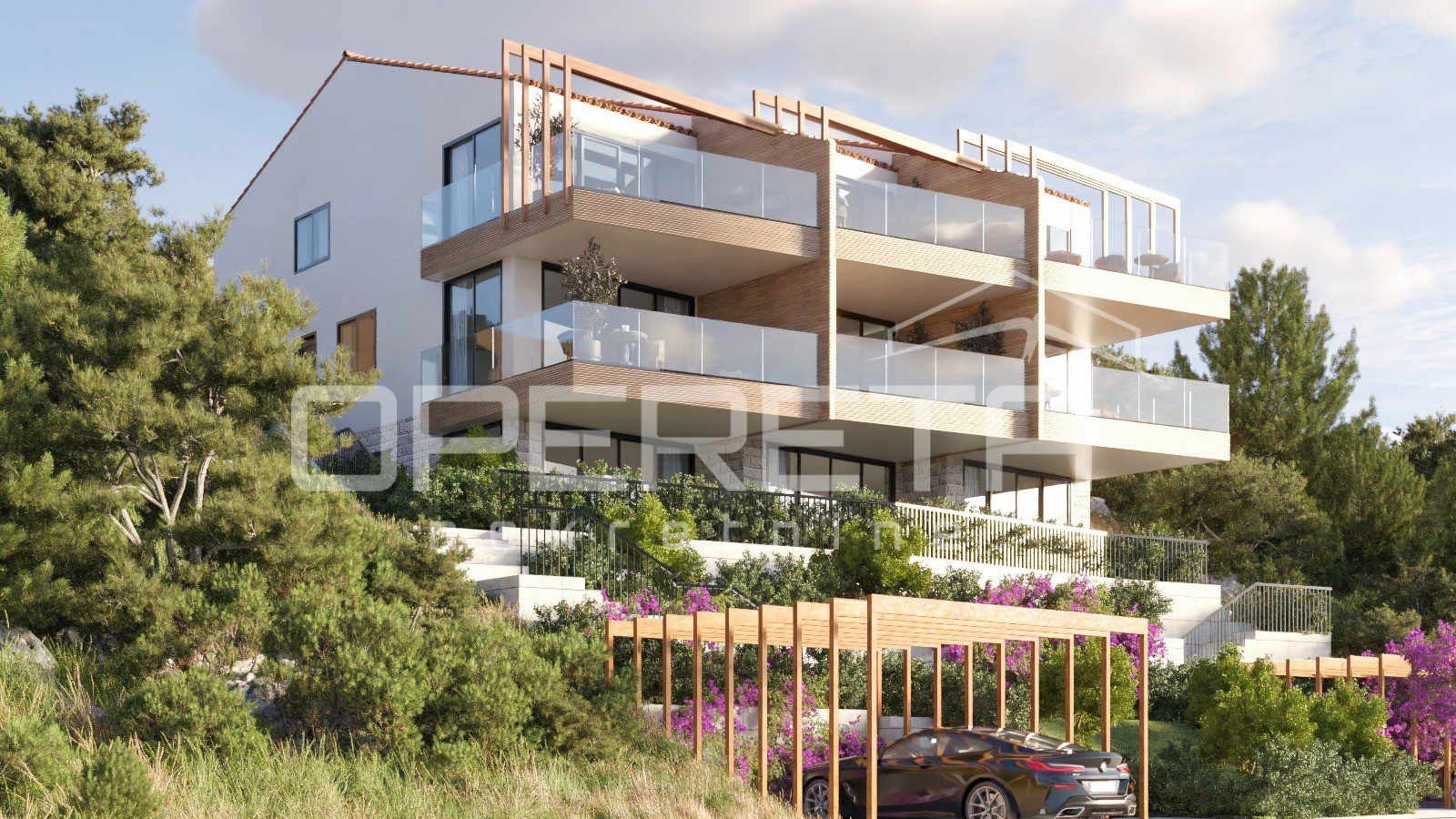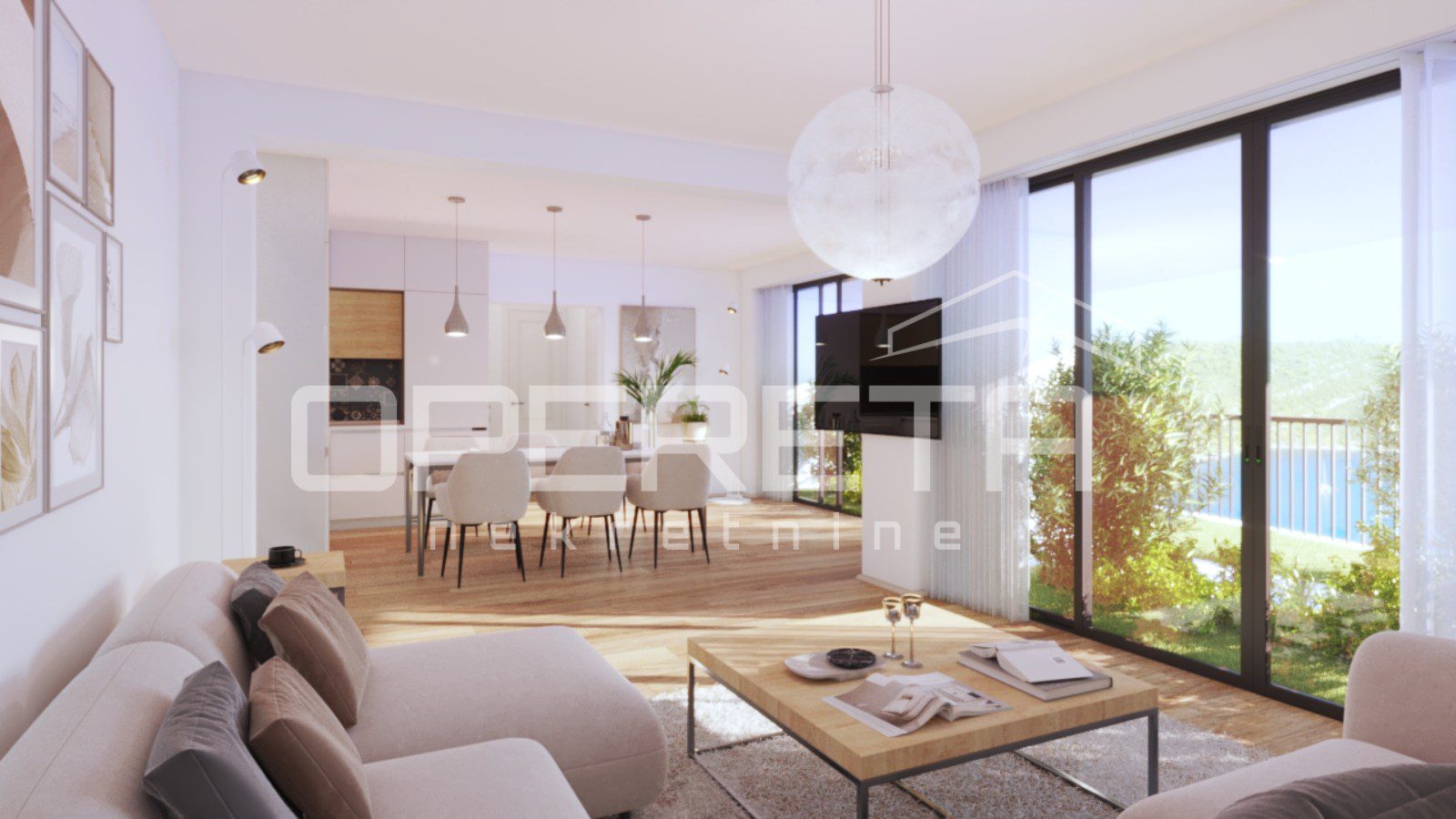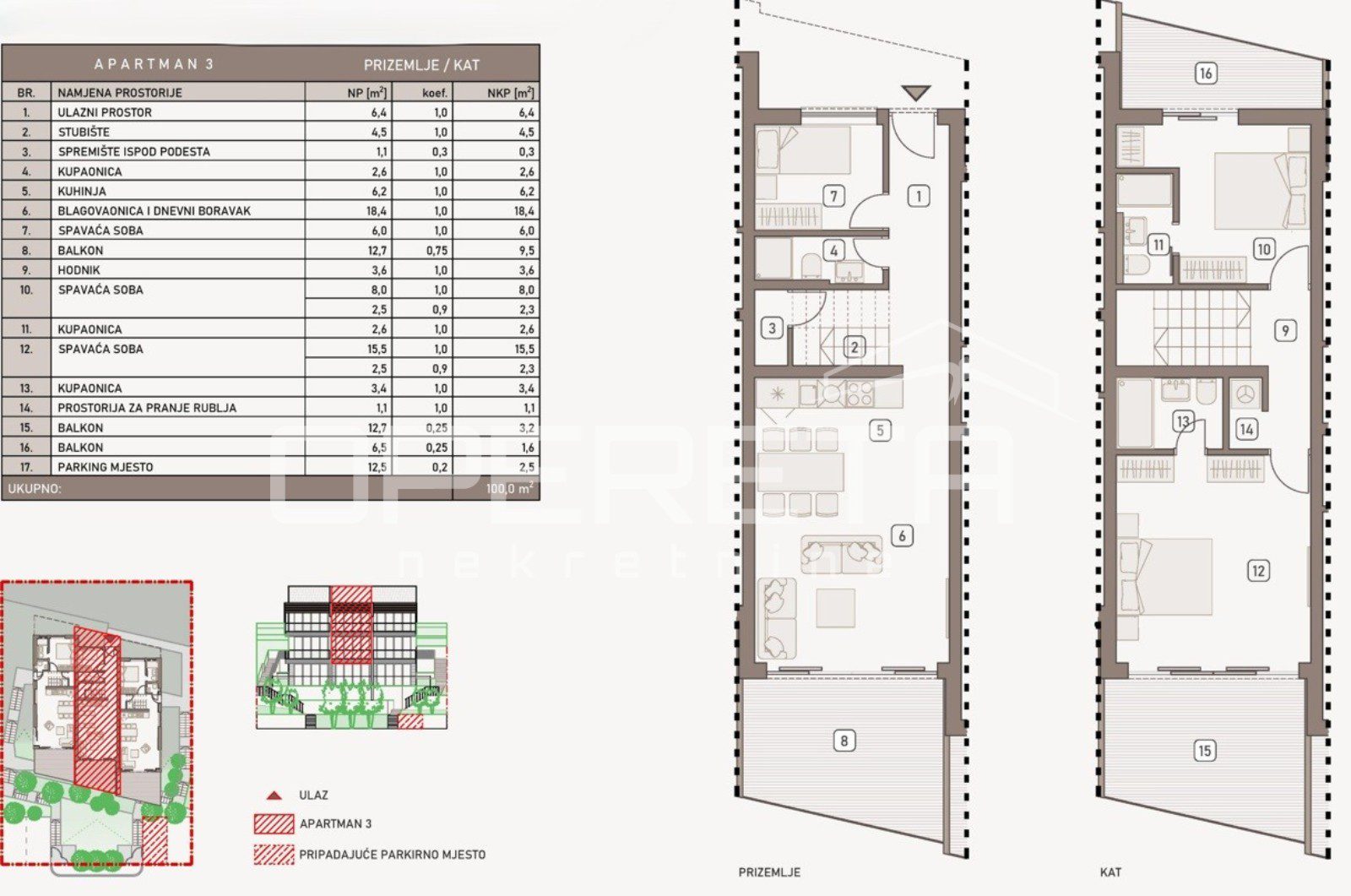 Stan se prostire na dvije etaže i ima ukupnu neto površinu od 100,0 m², s orijentacijom prema sjeveru i jugu. Donji kat čini otvoreni dnevni prostor s kuhinjom i blagovaonicom, te jedna spavaća soba i moderna kupaonica. Iz dnevnog boravka vodi izlaz na balkon s pogledom na zelenilo i more, čime se unutarnji prostor prirodno nadovezuje na eksterijer. Na gornjoj etaži nalaze se dvije spavaće sobe, svaka s vlastitom kupaonicom i privatnim balkonom, što omogućuje mir i zaseban prostor za sve članove domaćinstva.