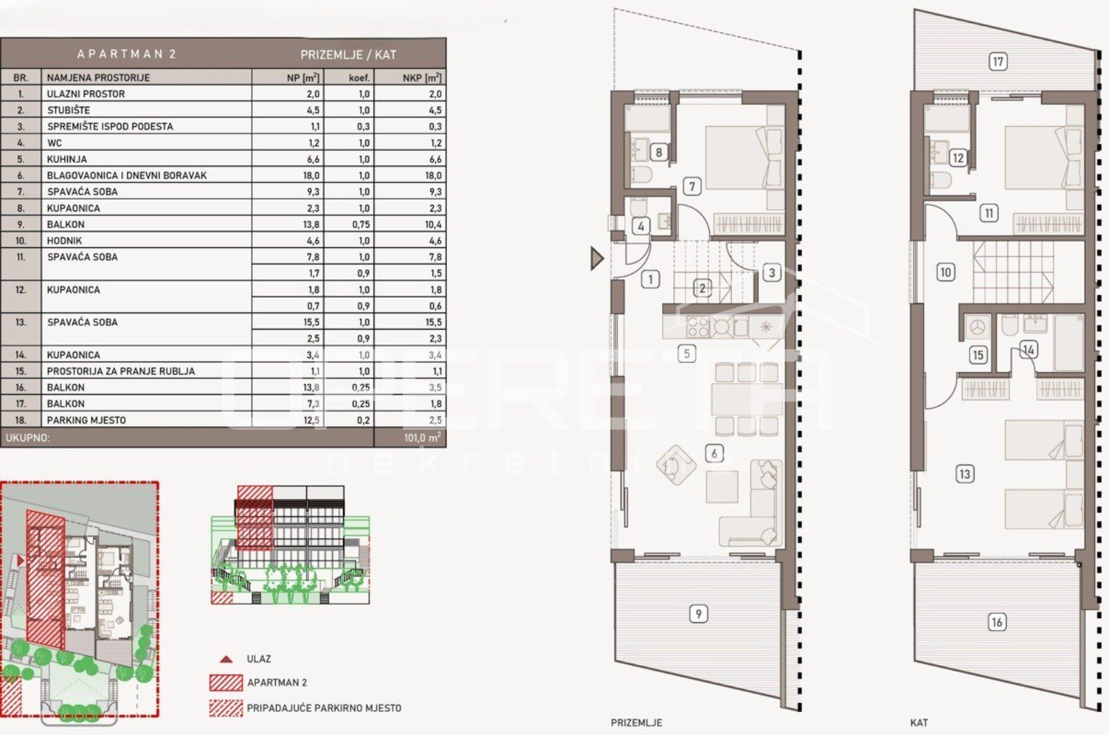 Ukupne površine 101 m², stan je raspoređen na prizemlje i kat s orijentacijom na sjever, zapad i jug, što osigurava obilje prirodnog svjetla i prekrasan pogled na more.