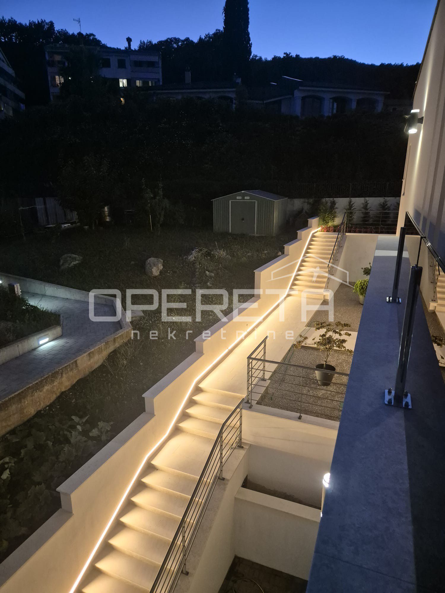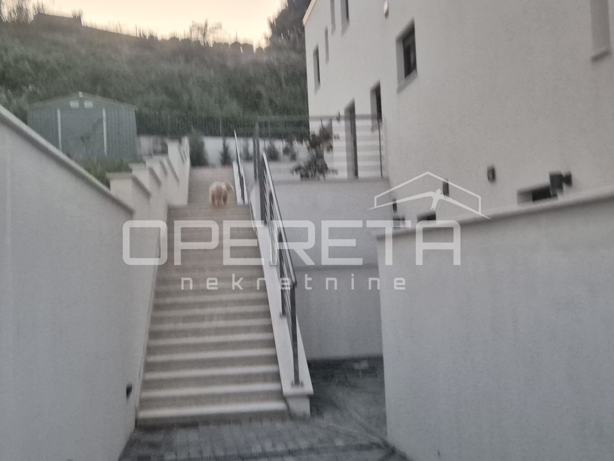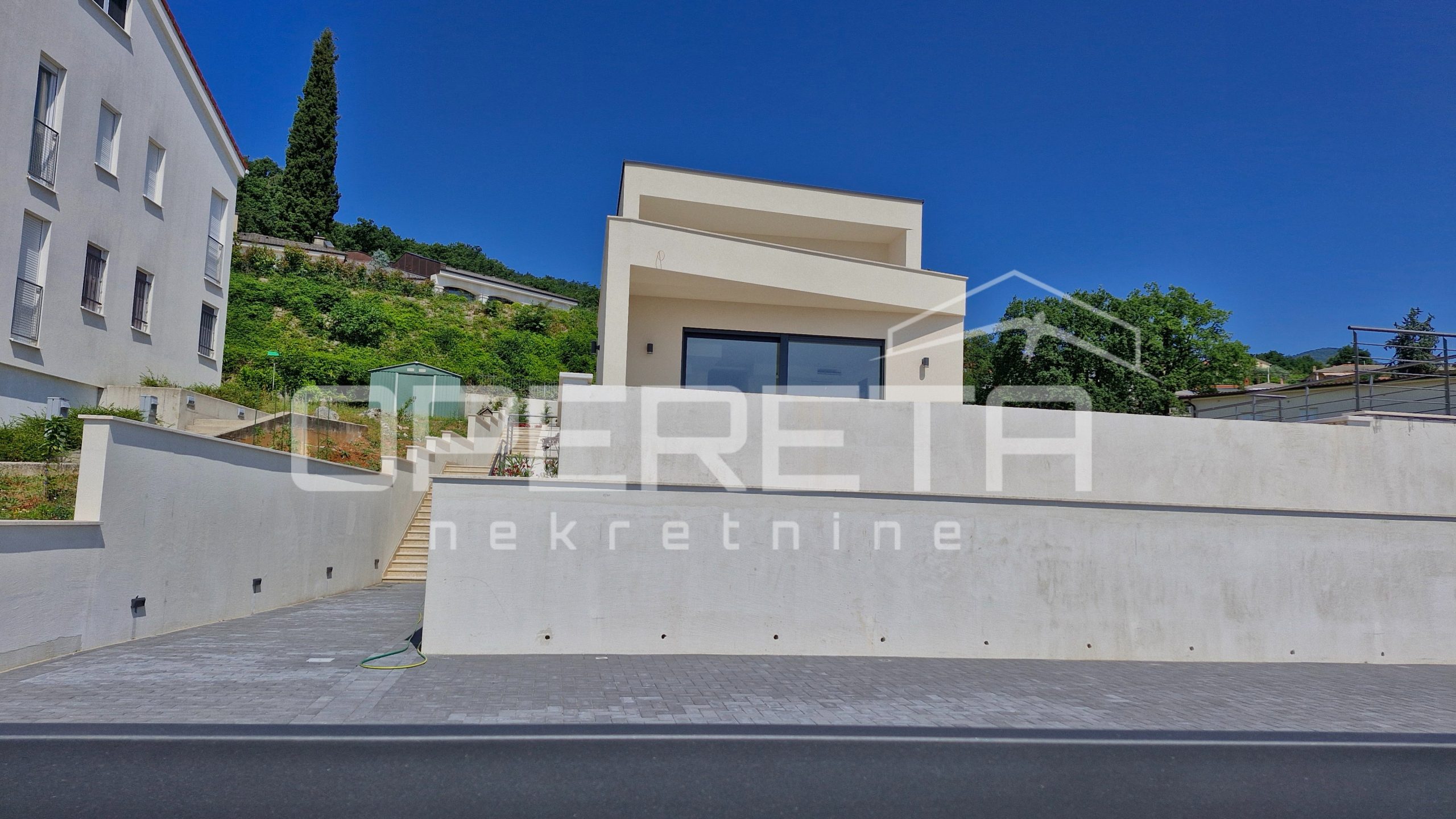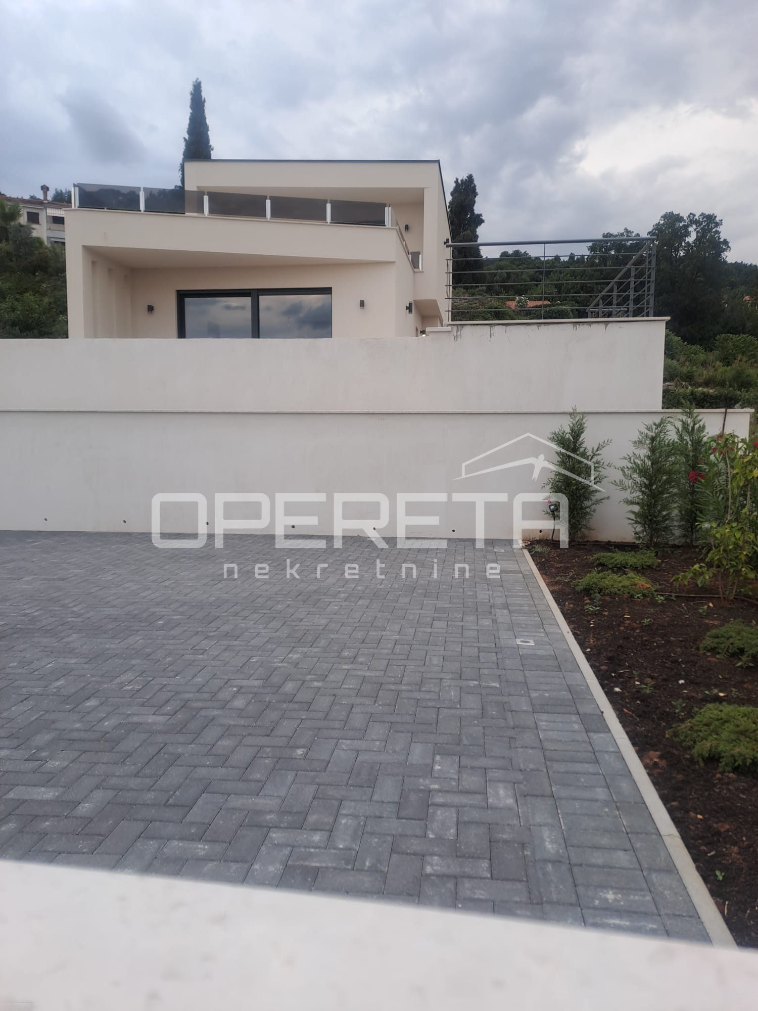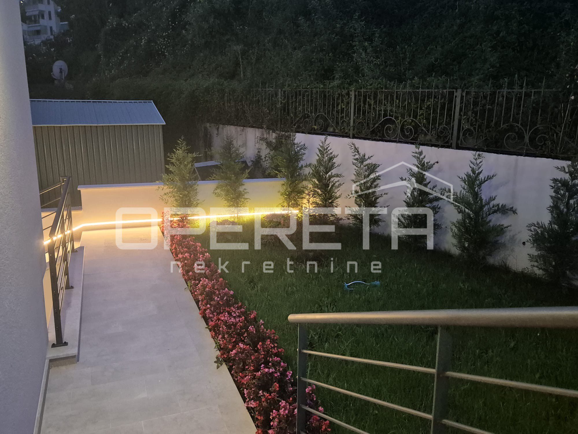 Uređena okućnica nudi privatnost, prostor za uživanje u mediteranskoj klimi i praktičnost u svakodnevici – uključujući privatni parking za više vozila unutar ograđenog dijela parcele.