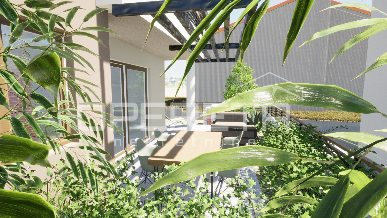 Stan se sastoji od prostranog dnevnog dijela s kuhinjom i blagovaonicom (27,74 m²), spavaće sobe (9,56 m²), garderobe (3,90 m²), kupaonice (5,35 m²), predsoblja (4,93 m²) te natkrivene terase od 10,65 m² koja izlazi na pripadajući dio okućnice.