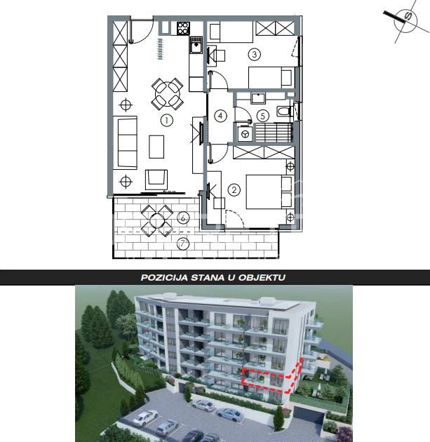 Stan A7 nalazi se na 1. katu neto obračunske površine 62,49m2, a sastoji se od: hodnika, dnevnog boravka, kuhinje i blagavaonice u open space konceptu, 2 prostrane spavaće sobe, kuponice, balkona i lođe. Ovaj prostor odiše kvalitetom, modernim dizajnom i pažnjom na detalje. Svaka prostorija je pažljivo osmišljena kako bi pružila maksimalnu udobnost i funkcionalnost.