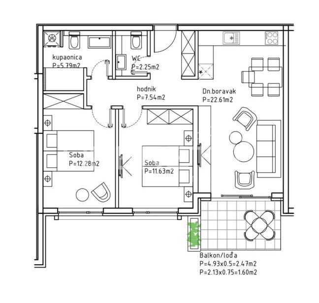 Ovaj stan se nalazi u zgradi broj 1, a površina stana iznosi 66,17 m² i sastoji se od: kupaonice (5,79 m²), WC-a (2,25 m²), hodnika (7,54 m²), dnevnog boravka s blagovaonicom (22,61 m²), dvije spavaće sobe (12,28 m² i 11,63 m²), balkona/lođe (4,93 m² i 2,13 m²)