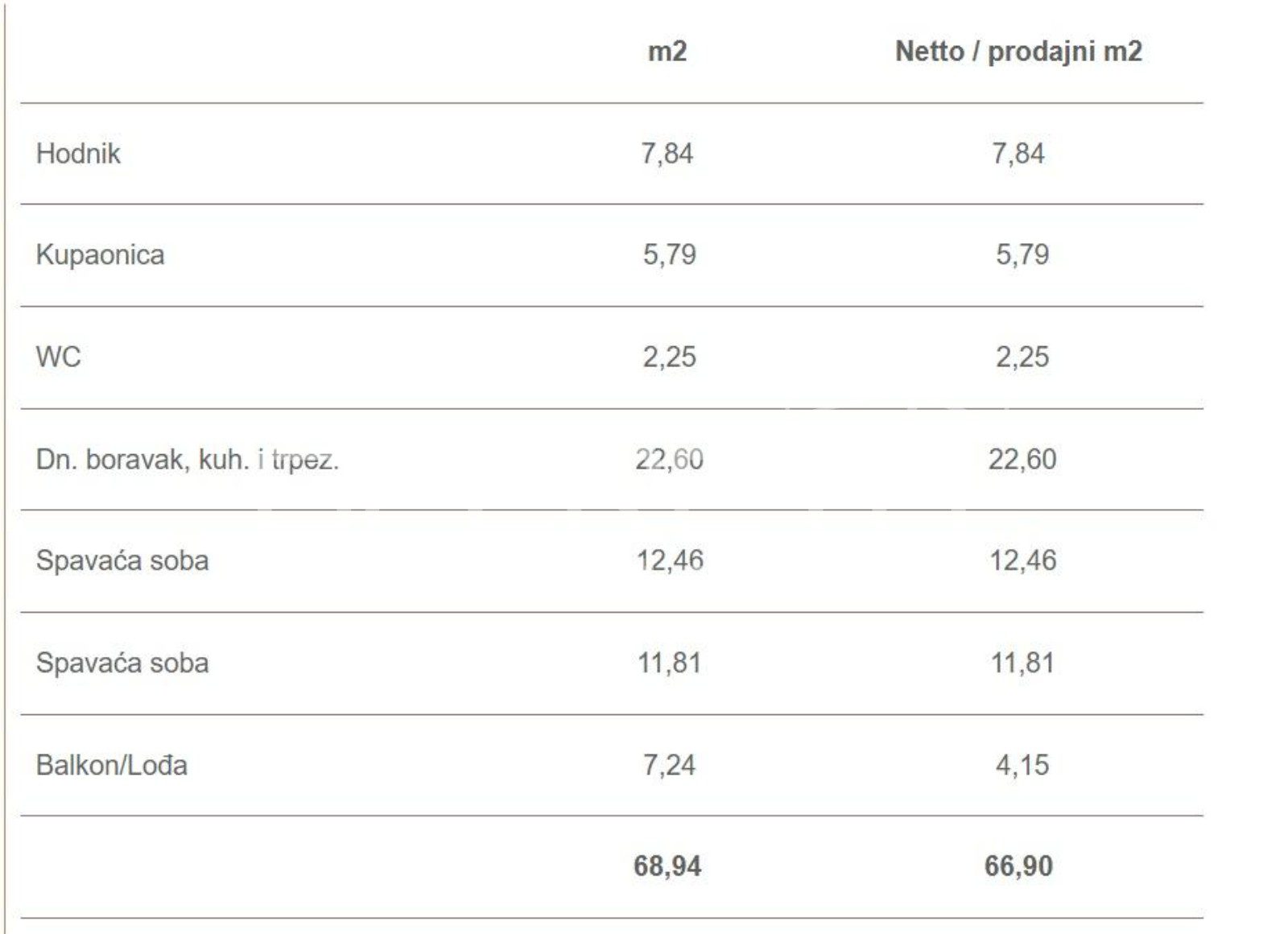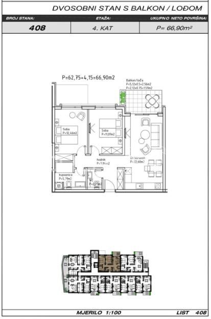 Stan S408 nalazi se u zgradi 2, na 4. katu, koji sadrži ukupne bruto površine 68,94m2 i neto površine od 66,90m². Ovaj sofisticirani stan sadrži hodnik, kupaonicu, wc, dnevni boravak/kuhinju/blagovaonicu, 2 spavaće sobe, te balkon/lođa, savršeno dizajniran za udoban i luksuzan život. Mogućnost useljenja u Q4/2025.