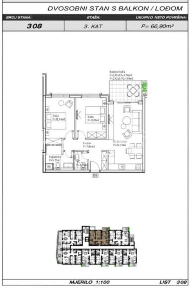 Stan S308 nalazi se u zgradi 2, na 3. katu, koji sadrži ukupne bruto površine 69,99m2 i neto površine od 66,90m². Ovaj sofisticirani stan sadrži hodnik, kupaonicu, wc, dnevni boravak/kuhinju/blagovaonicu, 2 spavaće sobe, te balkon/lođa, savršeno dizajniran za udoban i luksuzan život. Mogućnost useljenja u Q4/2025.
