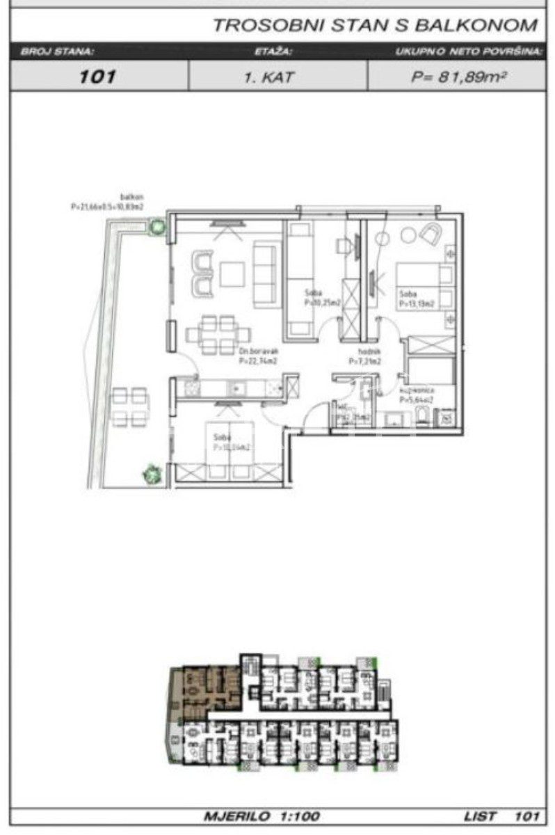 Stan S101 nalazi se u zgradi 2, na 1.katu, koji sadrži ukupne bruto površine 92,81m2 i neto površine od 81,89m². Ovaj sofisticirani stan sadrži hodnik, kupaonicu, wc, dnevni boravak/kuhinju/blagovaonicu, 3 spavaće sobe, te balkon, savršeno dizajniran za udoban i luksuzan život. Mogućnost useljenja u Q4/2025.