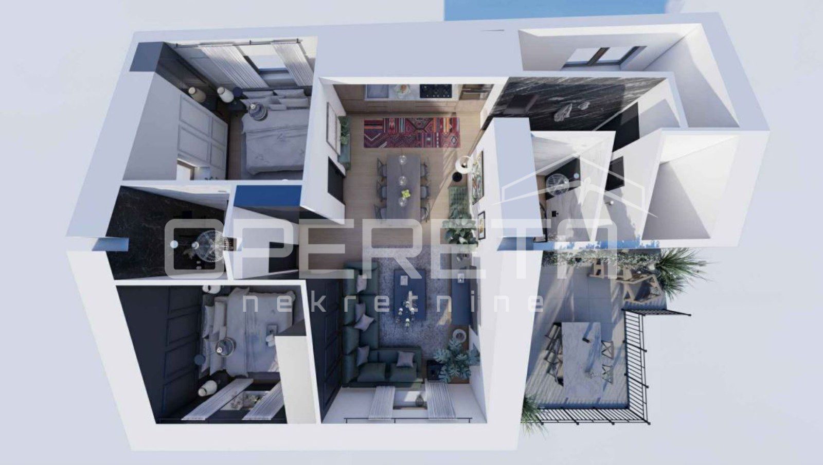 Stan je površine 69m2 + 18m2 terase, a sastoji se od open space prostora koji obuhvaća dnevni boravak, kuhinju i blagavaonicu,2 spavaće sobe.2 kupaone, prostorija za praonu i ostavu te hodnik sa ulaznim prostorom, prostranu nenatkrivenu terasu.