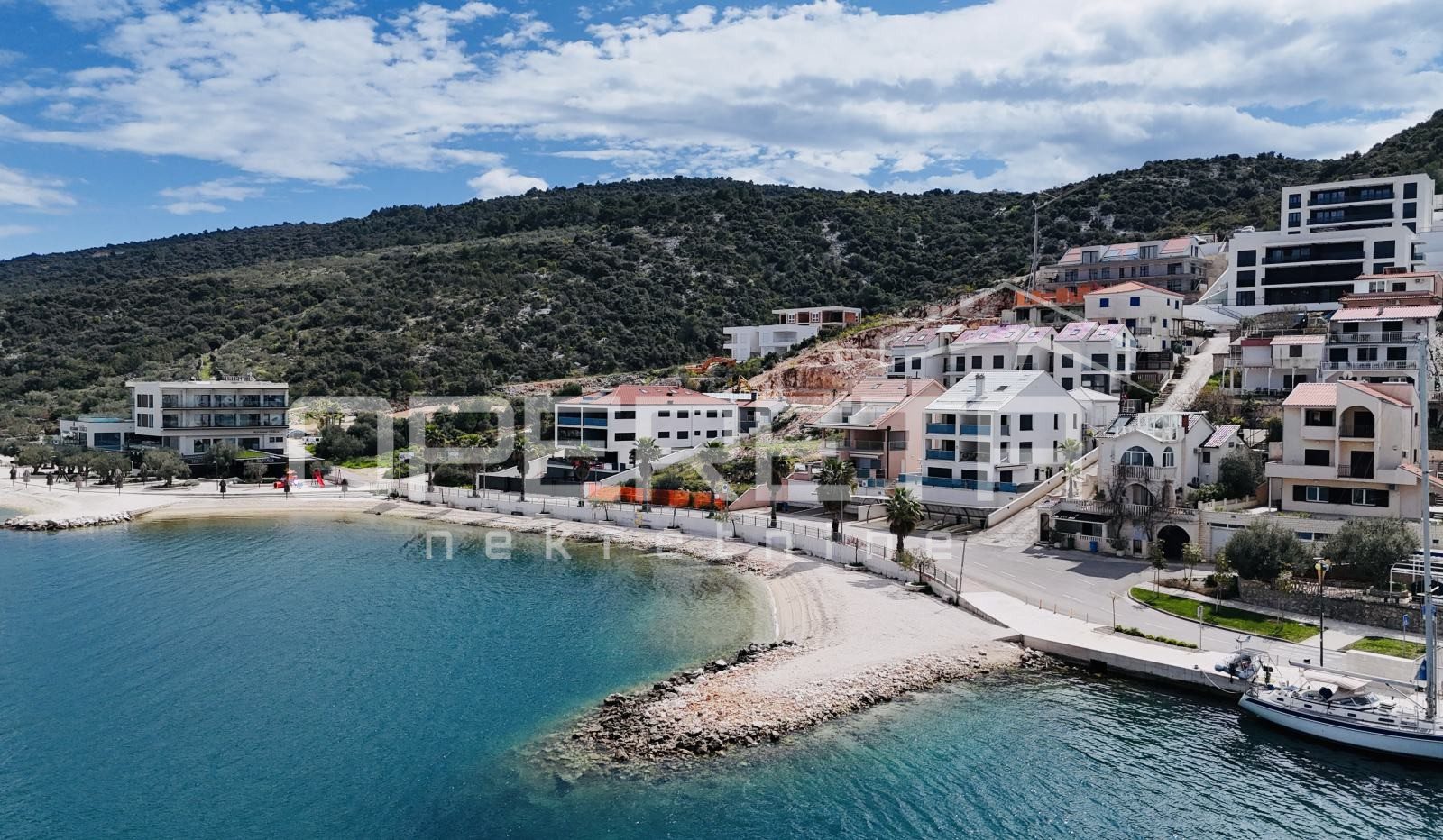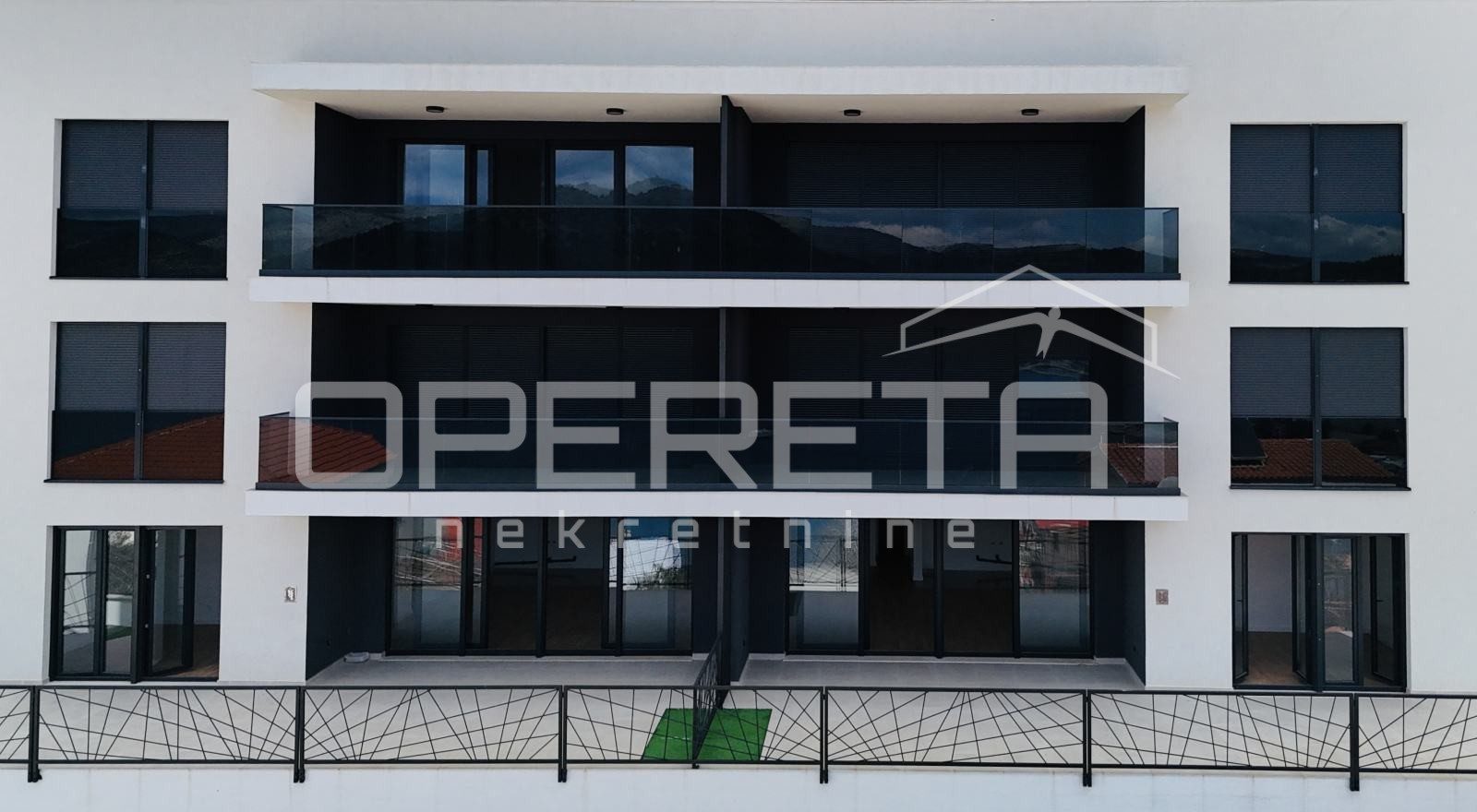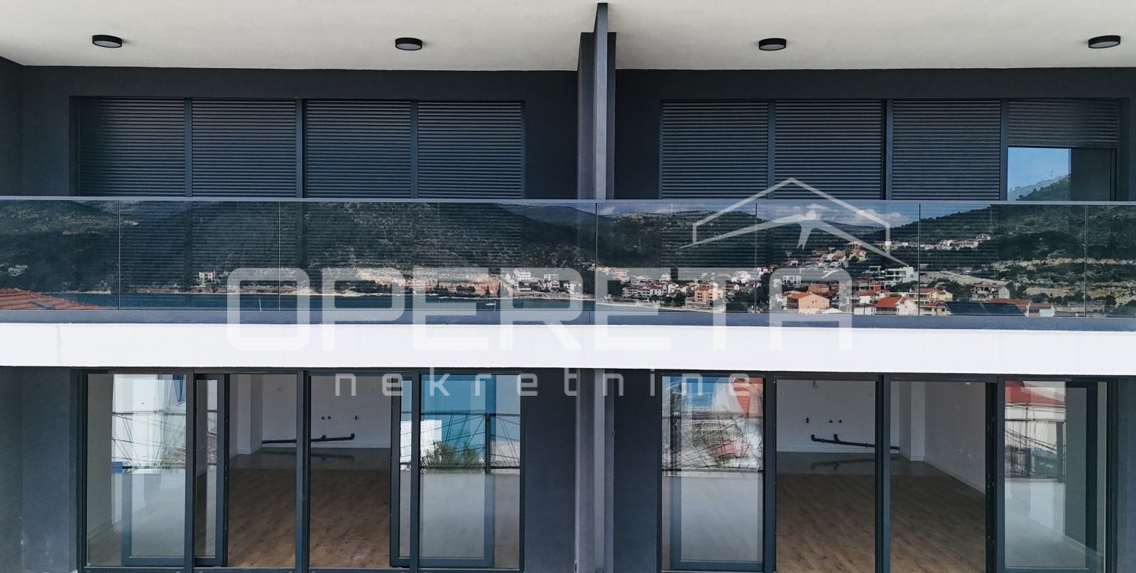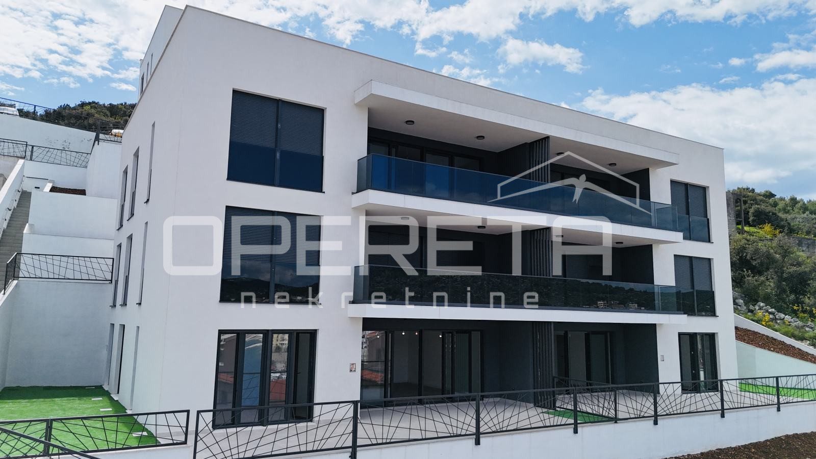 Prodaje se stan luksuznoj novogradnju u prizemlju u naselju Marina u okolici Trogira sa pogledom na more. Stan se sastoji od ulaznog prostora, dnevnog boravka sa kuhinjom, garderobe, wc-a, 2 kupaonice, 3 spavaće sobe, hodnika i lođe. Stan ima izlaz u vrt površine 21,08 m2.