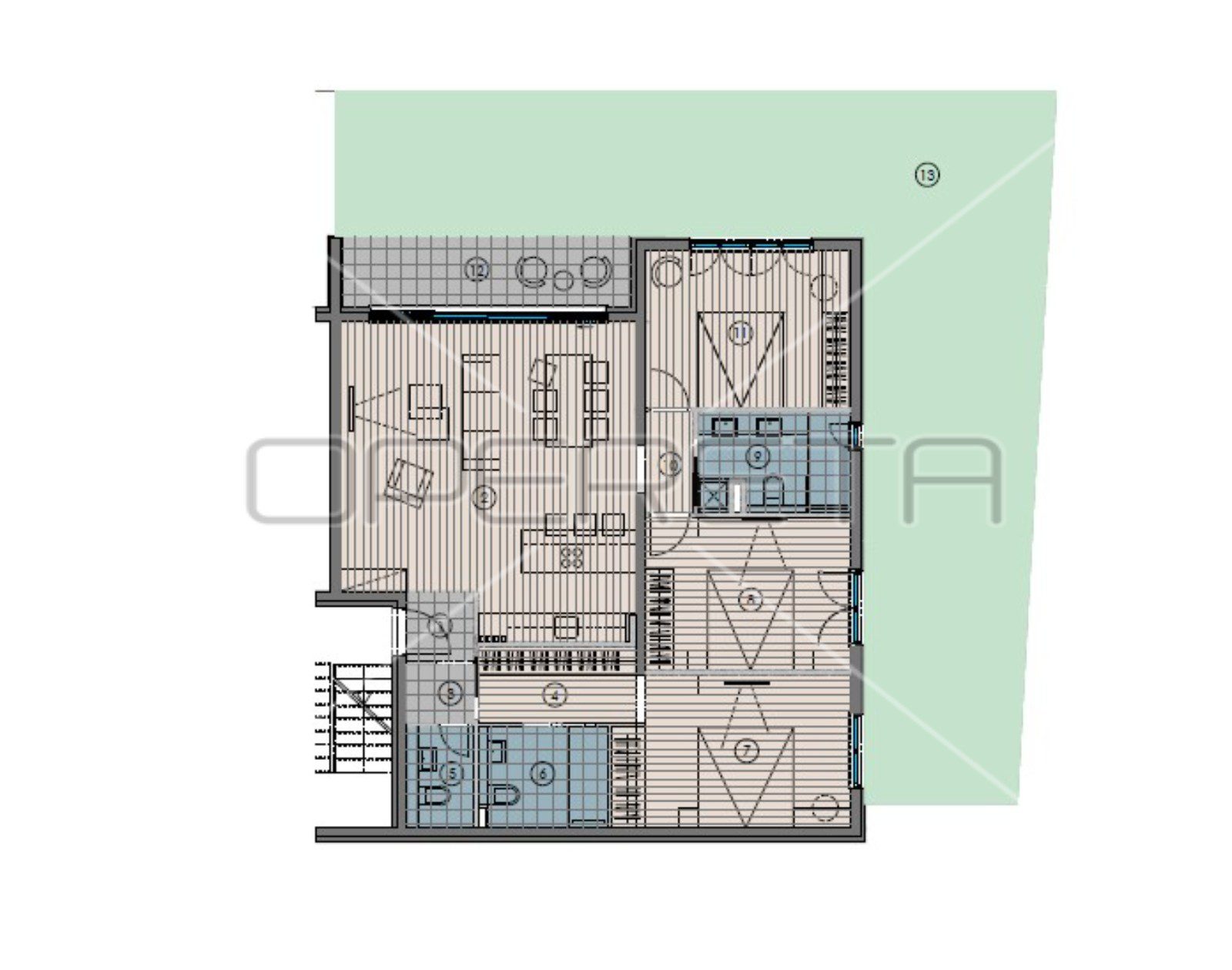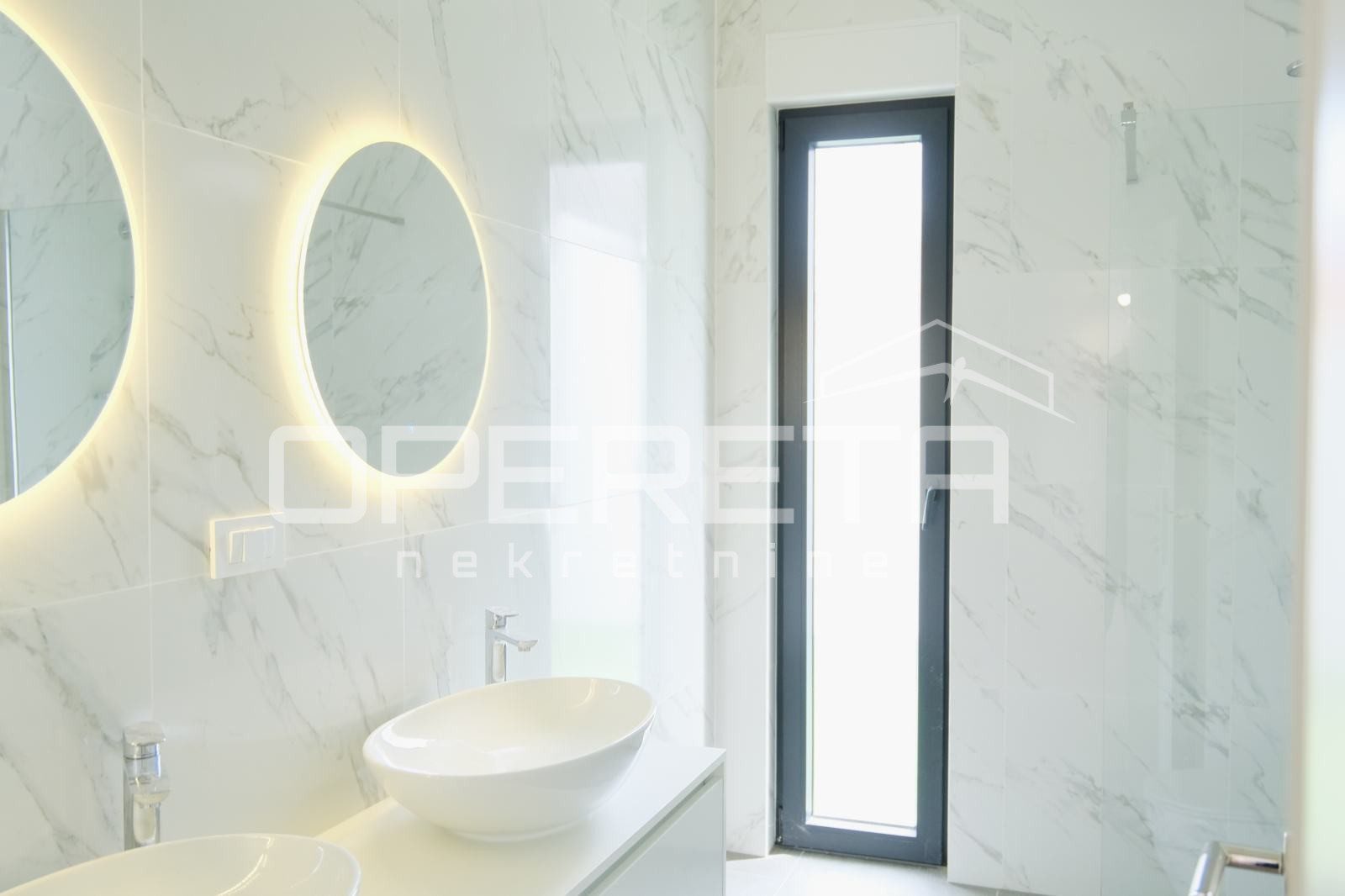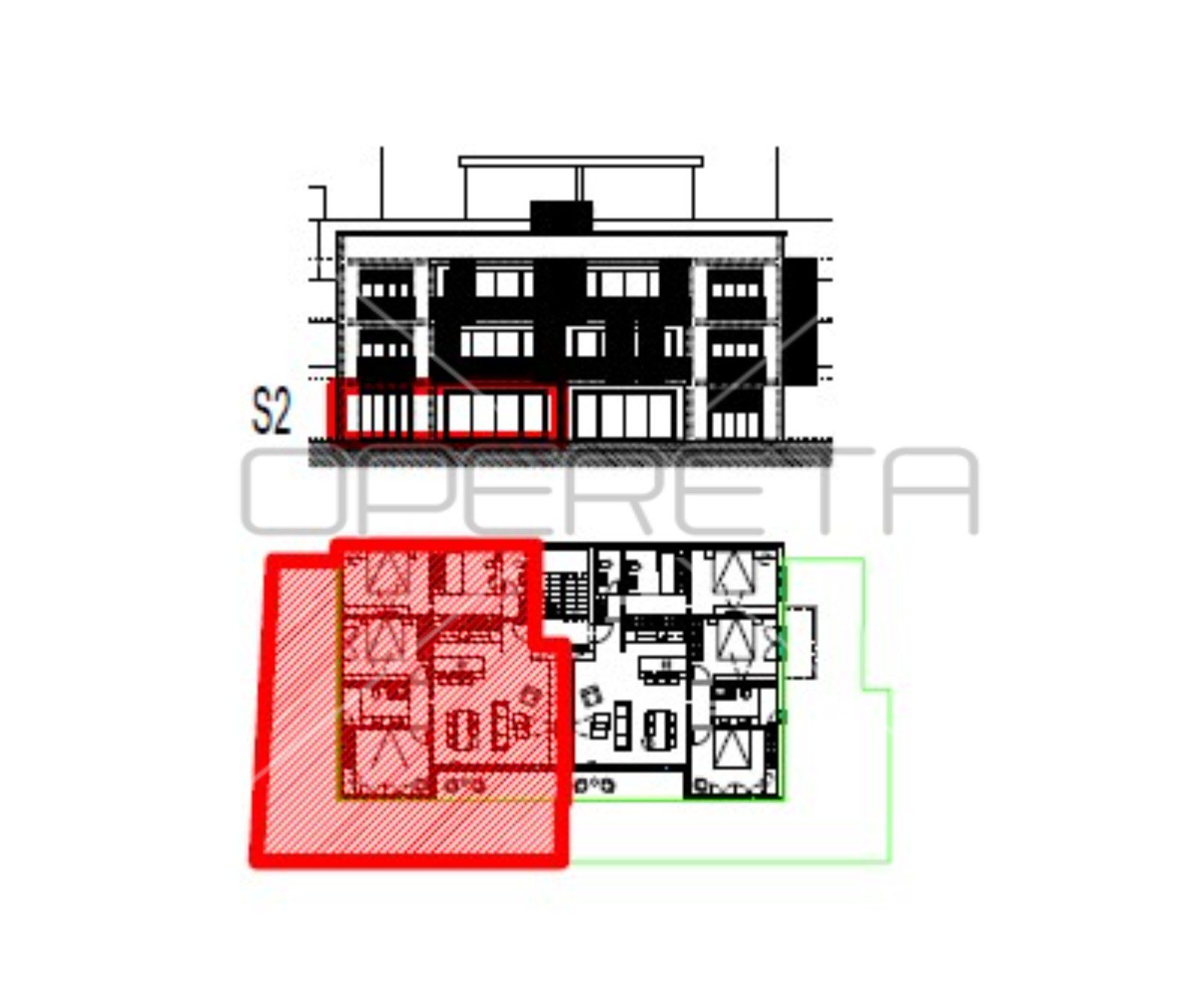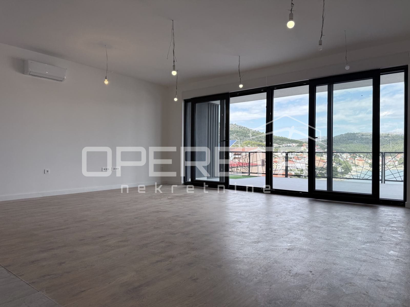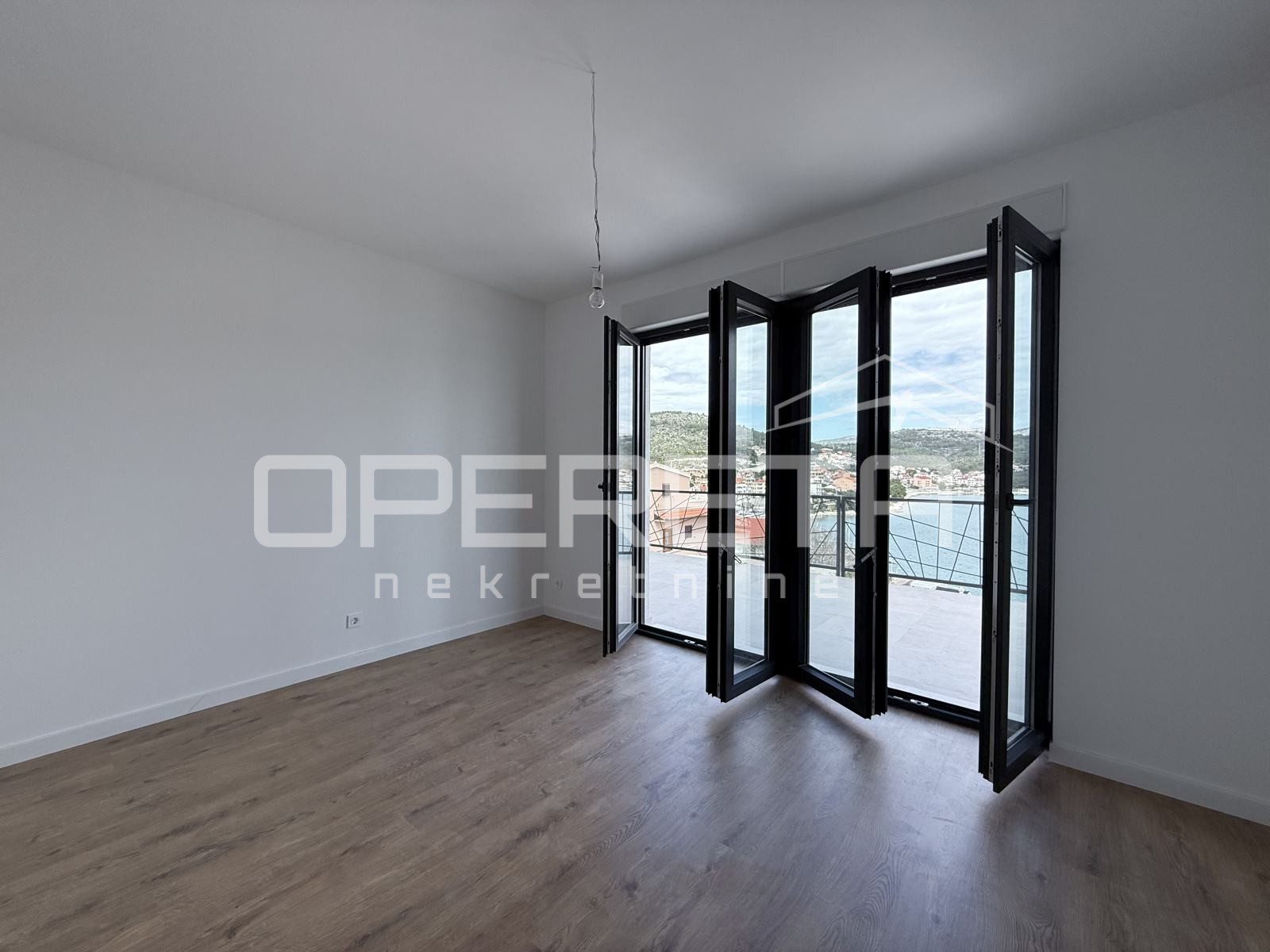 Prodaje se stan luksuznoj novogradnju u prizemlju u naselju Marina u okolici Trogira sa pogledom na more. Stan se sastoji od ulaznog prostora, dnevnog boravka sa kuhinjom, garderobe, wc-a, 2 kupaonice, 3 spavaće sobe, hodnika i lođe. Stan ima izlaz u vrt površine 21,08 m2.