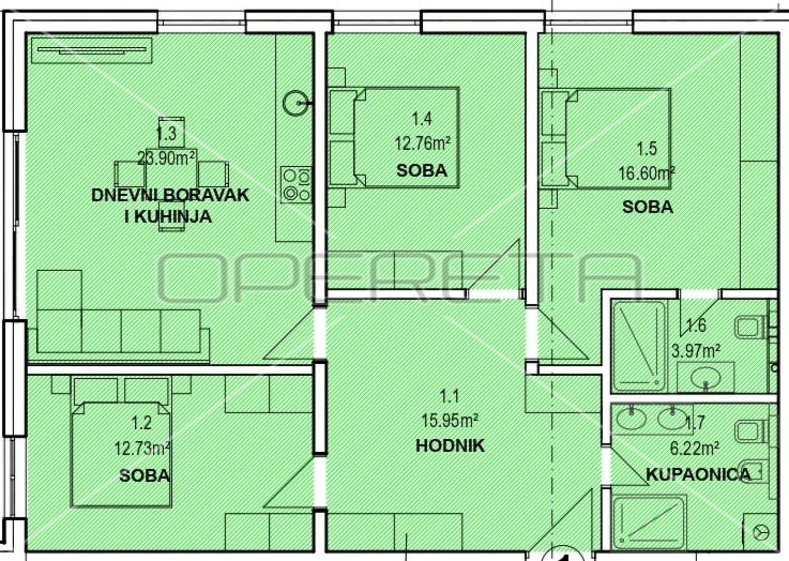 Neto korisna površina stana iznosi 110 m2, dok je stambene neto površine 92,13 m2.