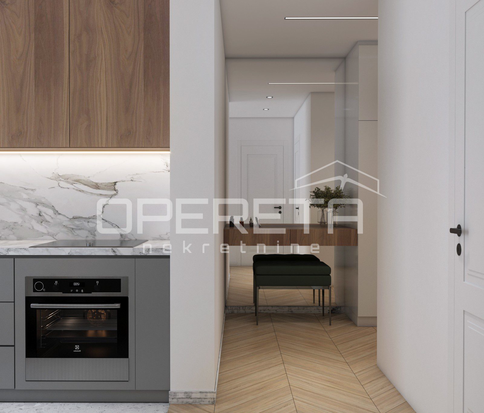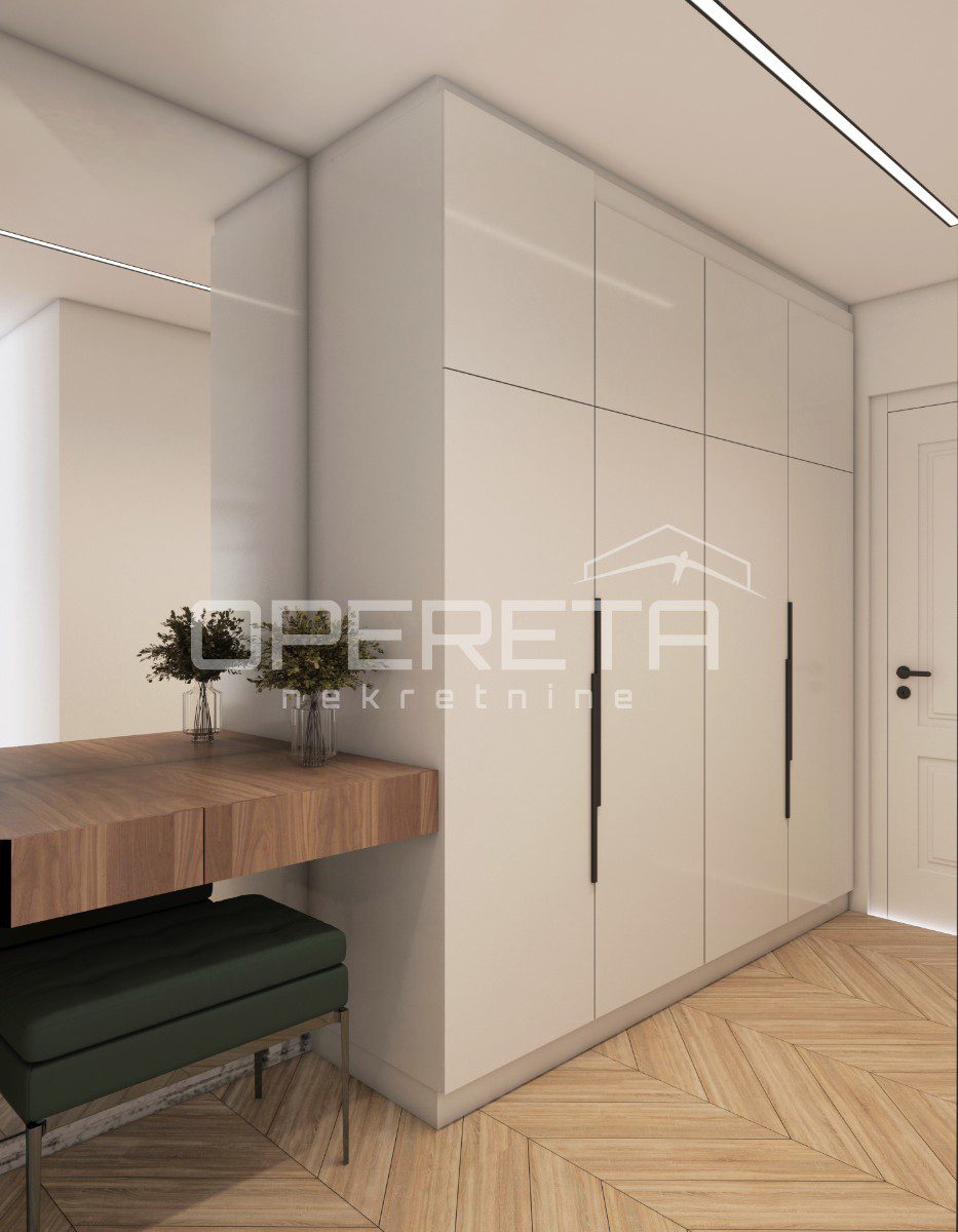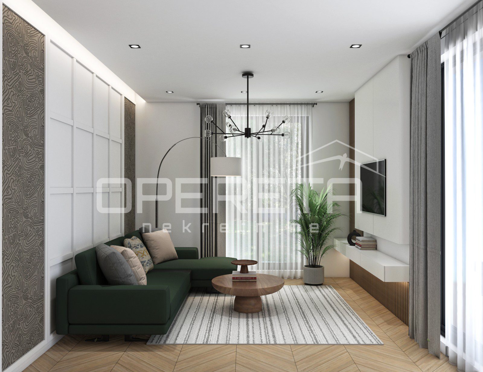 Stan obuhvaća ulazni hodnik, garderobu, spavaću sobu, kupaonicu te prostrani open space koncept s kuhinjom, blagovaonicom i dnevnim boravkom, s direktnim izlazom u vlastiti vrt površine 45,96 m².