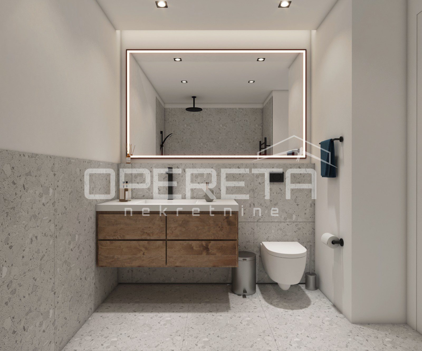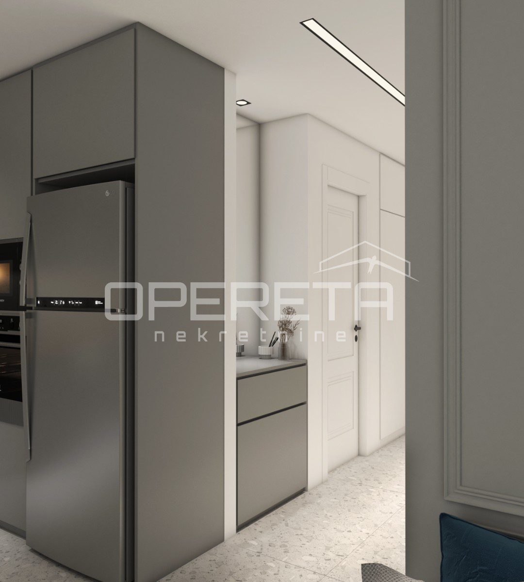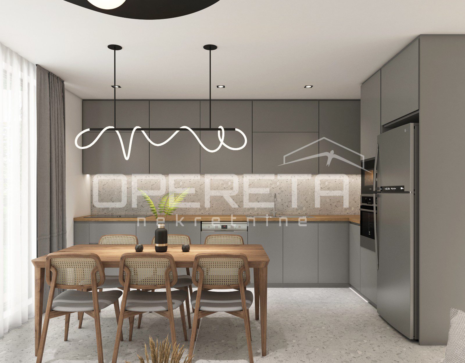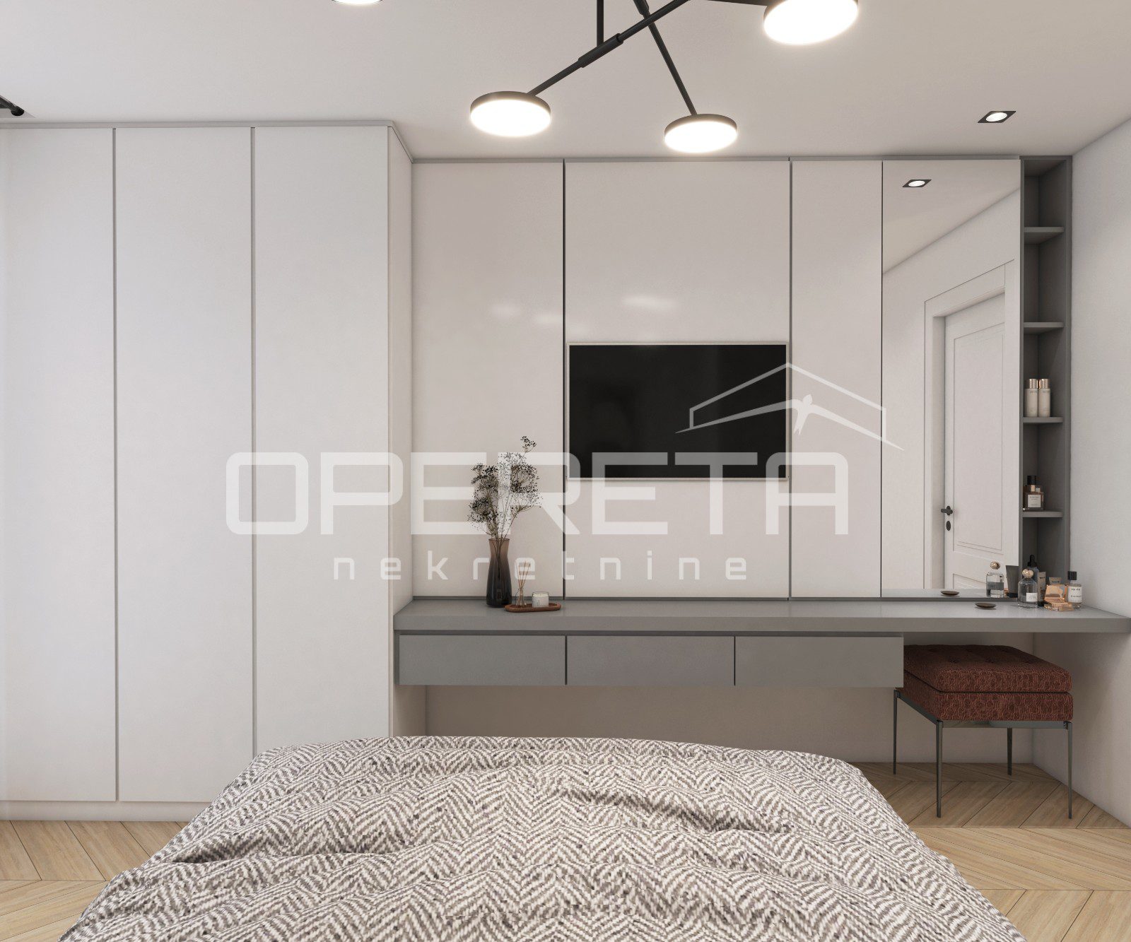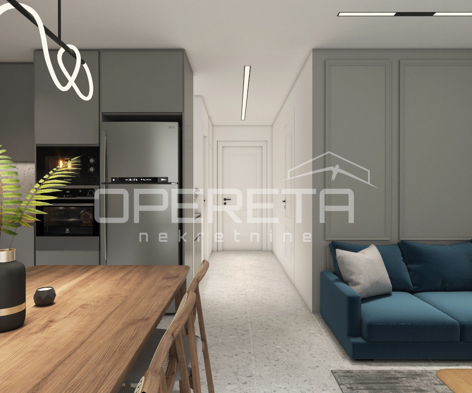 Stan obuhvaća ulazni hodnik, garderobu, spavaću sobu, kupaonicu te prostrani open space koncept s kuhinjom, blagovaonicom i dnevnim boravkom, s direktnim izlazom na terasu s koje se pruža pogled prema moru