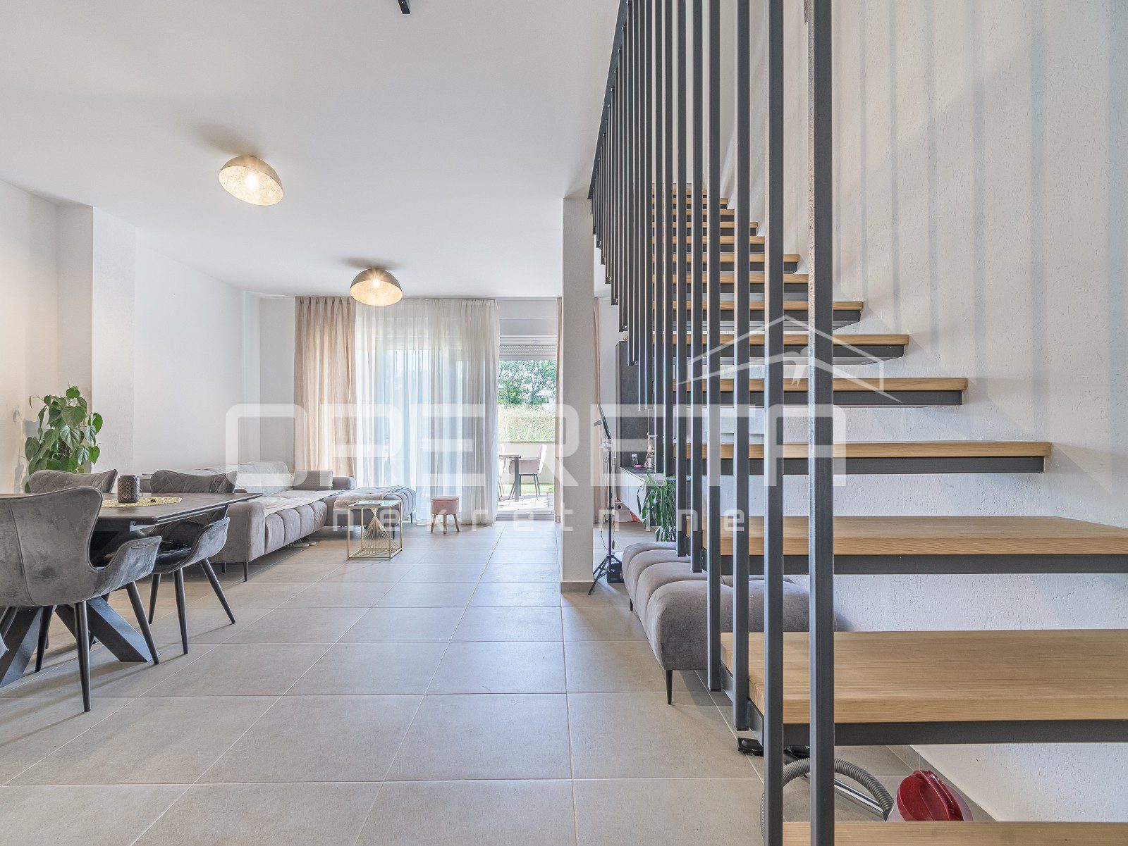 U prizemlju se nalazi ulazni hodnik, gostinjski toalet te moderno uređen open space prostor koji uključuje kuhinju, blagovaonicu i dnevni boravak s izlazom na vrt – idealan za opuštanje ili druženje na otvorenom.