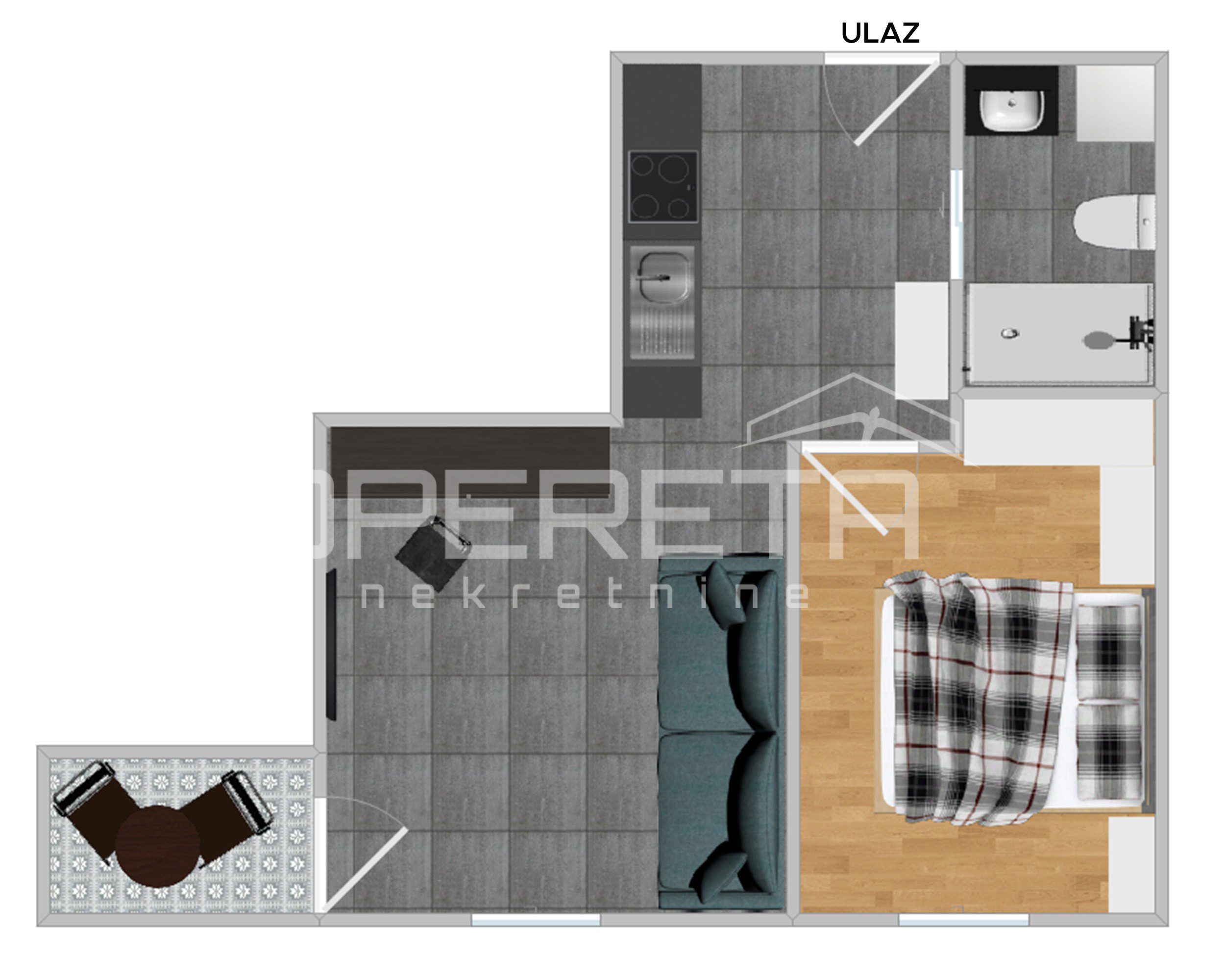 Stan je smješten urednoj i održavanoj zgradi na 1. katu površine 41 m2. Sastoji se od spavaće sobe, kupaone, dnevnog boravaka, kuhinje te balkonom s lijepim otvorenim pogledom na Novigrada i more. Nedavno je kompletno renoviran te se kao takav, potpuno opremljen i prodaje. Podno grijanje postavljeni je u kupaonici, dnevnom boravku i kuhinji. Stan u vlasništvu ima parkirno mjesto i mogućnost kupnje vanjskog spremišta.
