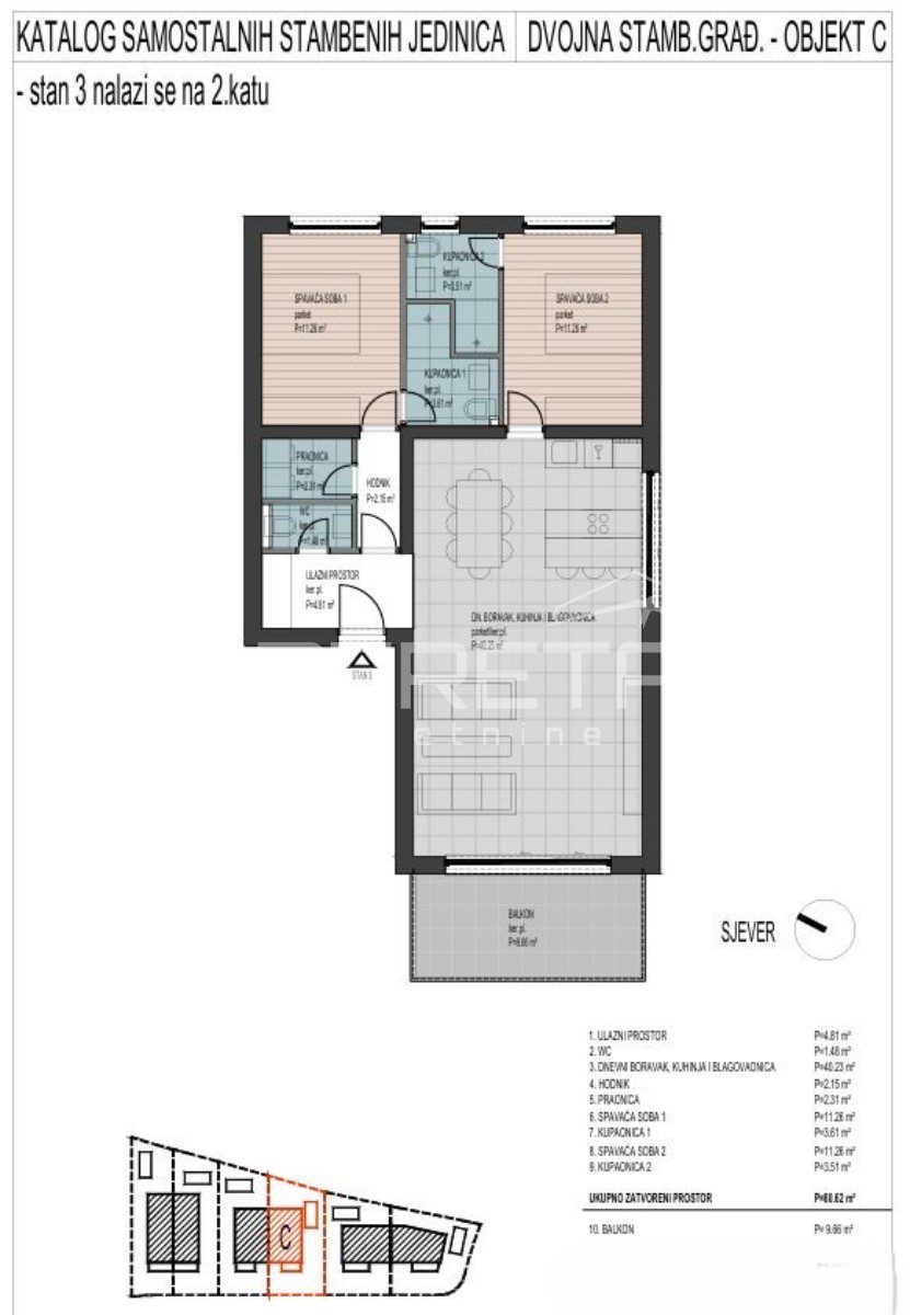 Stan S3C smješten je na 2. katu, stambene površine 80,62 m², s pažljivo osmišljenim rasporedom: hodnik, praonica, WC, 2 kupaonice, prostrani dnevni boravak i blagavaonica, kuhinja, 2 dvije spavaće sobe i balkon od 9,66 m² (koef. 0,50).