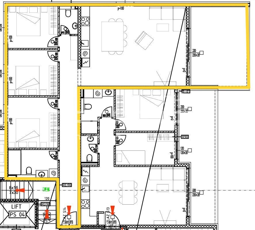 Stan S14 se nalazi u prizemlju zgrade s ukupno 28 jedinica, stambene površine 117,34m2 i ukupne obračunske površine 106,37m2. Sastoji se od: hodnika, kuhinje+blagavaonica+dnevni boravak, 3 spavaće sobe, kupaonice, wc-a i prostrane lođe od 21,95m2 (koef. 0,50=10,98m2).